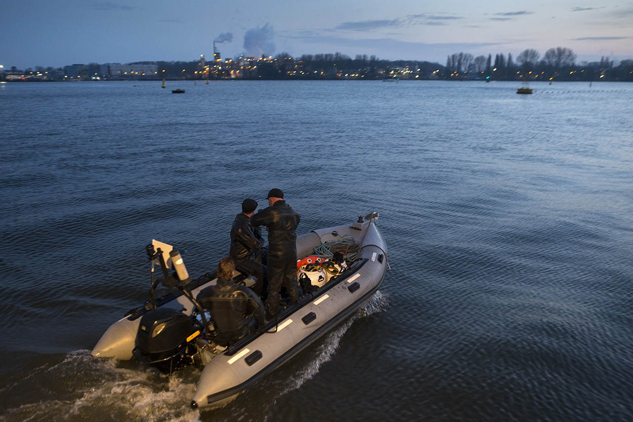 Levensgevaarlijk sluimert een Duitse WO 2-mijn in het IJ bij Amsterdam, tot deze op 4 april onschadelijk wordt gemaakt. Na gedane arbeid keren de mannen van de Defensie Duikgroep terug. (Foto: SM Gerben van Es)