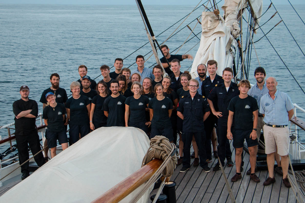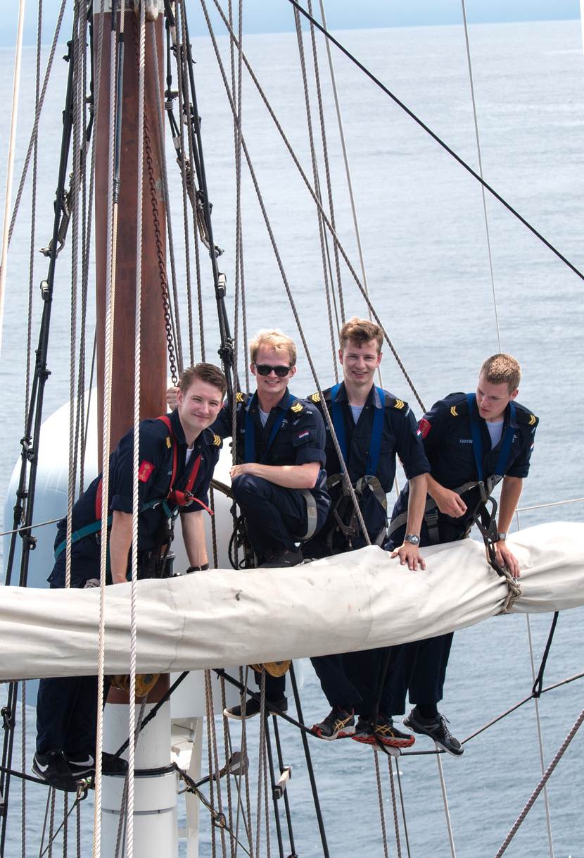 Meevaren met een tallship was wennen voor de jonge officieren in spe. “In het begin heb je geen idee wat je aan het doen bent. We zagen levensgrote zeildoeken en lijnen liggen. We werden overal heen gestuurd. Zo kregen we een lijn in onze handen gedrukt en begonnen we er maar direct aan te trekken. Na wat uitleg begrepen we het nut van de lijn. Na een tijdje leerden we wat er voor nodig was om een zeil te zetten. Aan het einde van de reis lukte het zelfs bijna om het zelfstandig te doen.”