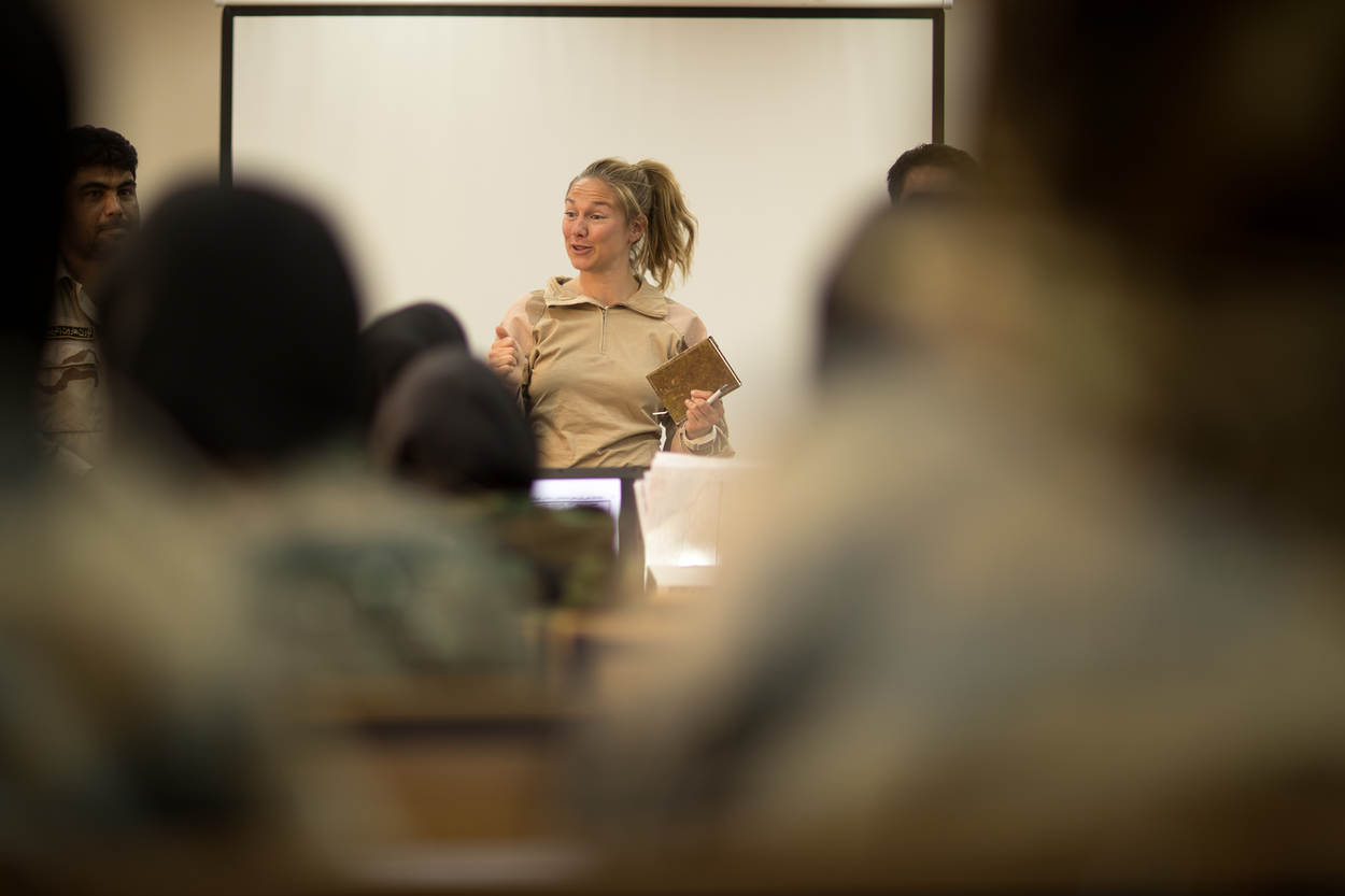 “Huisje in, trappetje op”, legt de Afghaanse instructeur kaartlezen uit. Hij is één van de mensen die door Nederland zijn opgeleid tijdens NAVO-missie Resolute Support. Het is de bedoeling dat hij weer nieuwe instructeurs klaarstoomt, zodat het als een olievlek werkt. De dames in de klas luisteren aandachtig naar hem en buigen zich geconcentreerd over hun grote landkaarten om coördinaten te berekenen. “De Taliban verbiedt onderwijs; hier konden we ons een paar jaar geleden nog niets bij voorstellen”, stelt gender advisor luitenant ter zee 2 Miriam.