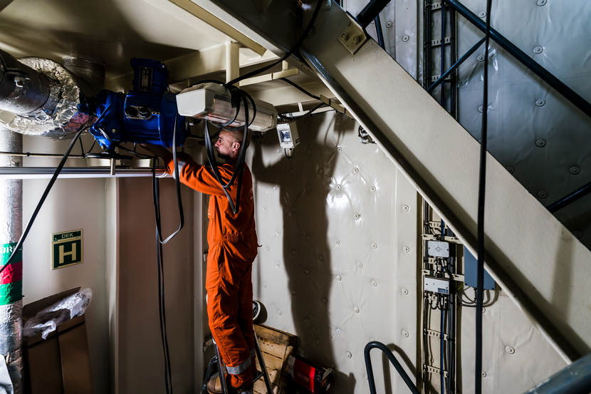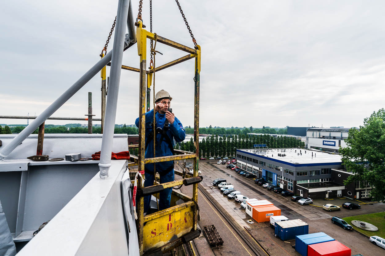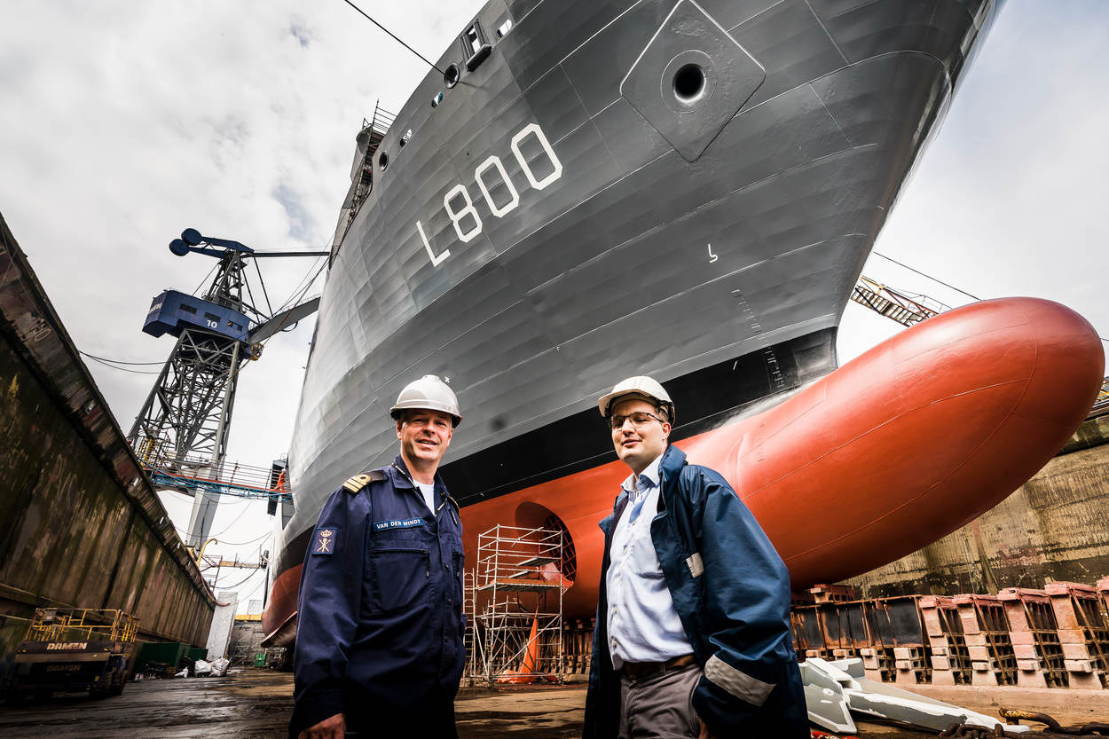 Van der Windt werkt in totaal 6 maanden in onze hoofdstad, waar het schip in het dok ligt van Damen Shiprepair Amsterdam. “Zo’n 85 bemanningsleden, voornamelijk van de Technische Dienst, zijn meegekomen. Leven en werken op het schip kan nu niet, dus verblijven ze in portocabins ernaast.” Een marineschip blijft nooit onbewaakt. 24 uur per dag lopen marinemensen wacht. Alle werklieden van burgerbedrijven gaan door de toegangscontrole voor ze het schip betreden. Dat zijn zo’n 300 werklieden van externe bedrijven en onderaannemers door het schip voor 250 meewerkopdrachten. Dat gaat bijvoorbeeld om extra reparaties aan pompen, afsluiters en elektra. Eind augustus keert het schip terug naar thuishaven Den Helder. “In 6 maanden ronden we daar dan de 2ehelft van het onderhoud af”, licht Van der Windt toe.