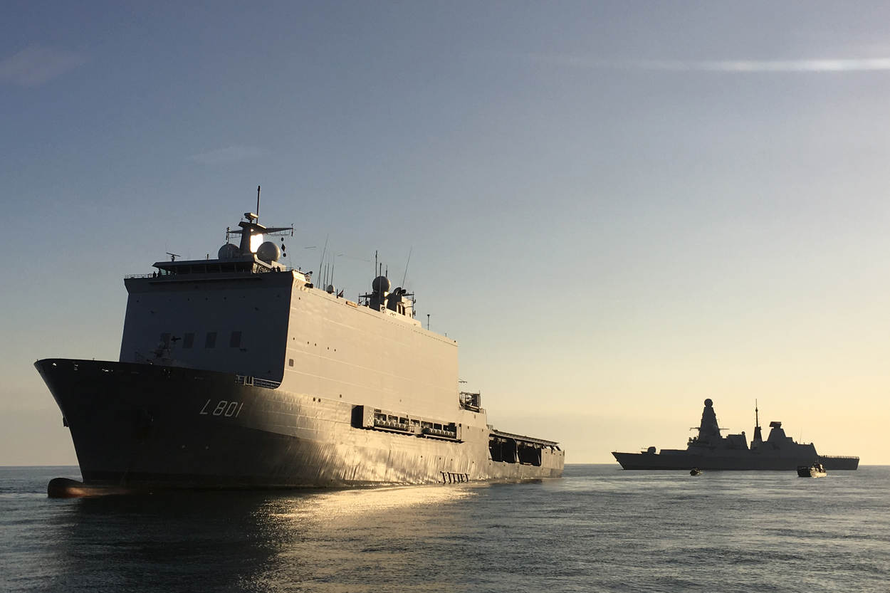 “Dekken, dekken, dekken over stuurboord”, schalt het door de luidsprekers. De spanning die luitenant ter zee 1 William van der Geest via de intercom weet over te brengen, is voelbaar. Aan boord leidt het Hoofd Operationele Dienst de verdediging. Op het bovendek komt het snelvuurkanon Goalkeeper hoorbaar razendsnel in positie. Op wat klein kaliber mitrailleurs na, heeft de Johan de Witt niet meer bewapening. Maar het Landing Platform Dock weet zich gesteund door 5 fregatten, die eveneens bij FOST oefenen. “De Britse trainingsorganisatie is in staat om 5 tot 7 schepen tegelijk te trainen”, begint Netherlands Liaison Officer FOST kapitein-luitenant ter zee George Pastoor.