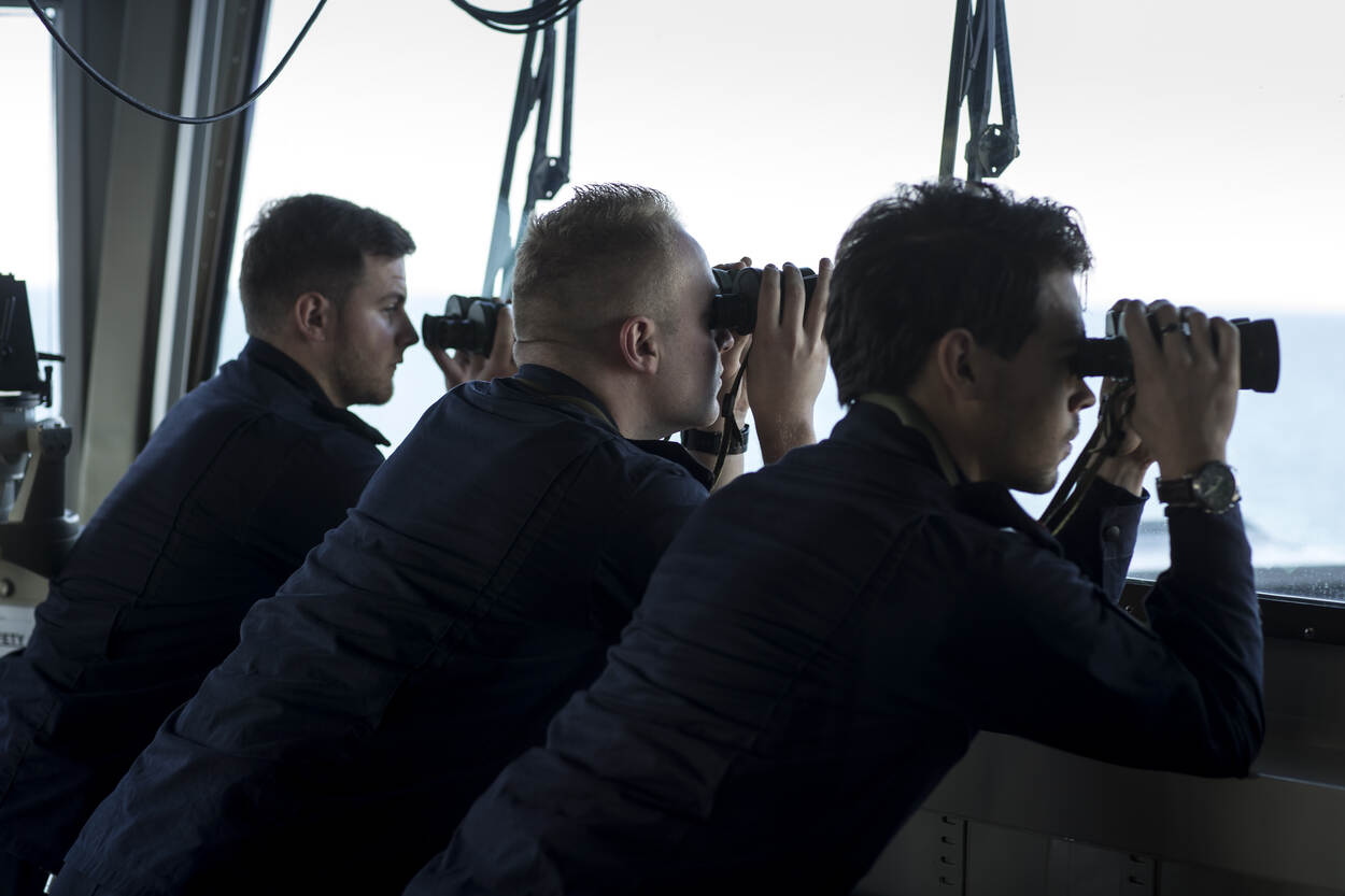 Boots, verrekijker nog om de nek, blijft met gemengde gevoelens op de brugvleugel achter. Enerzijds is er overduidelijk trots. “Zoals je ziet: hier zijn we op ingericht. Bedenk goed, we varen amper 15 mijl uit de kust van de Krim. Het kan inderdaad zijn dat de sfeer opeens omslaat. Daar moet je absoluut rekening mee houden. Je weet het nooit.” Daarna, schokschouderend: “Maar eerlijk? Ik zie het nu niet snel gebeuren.”