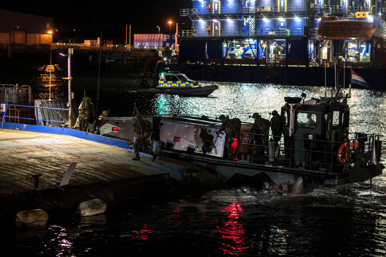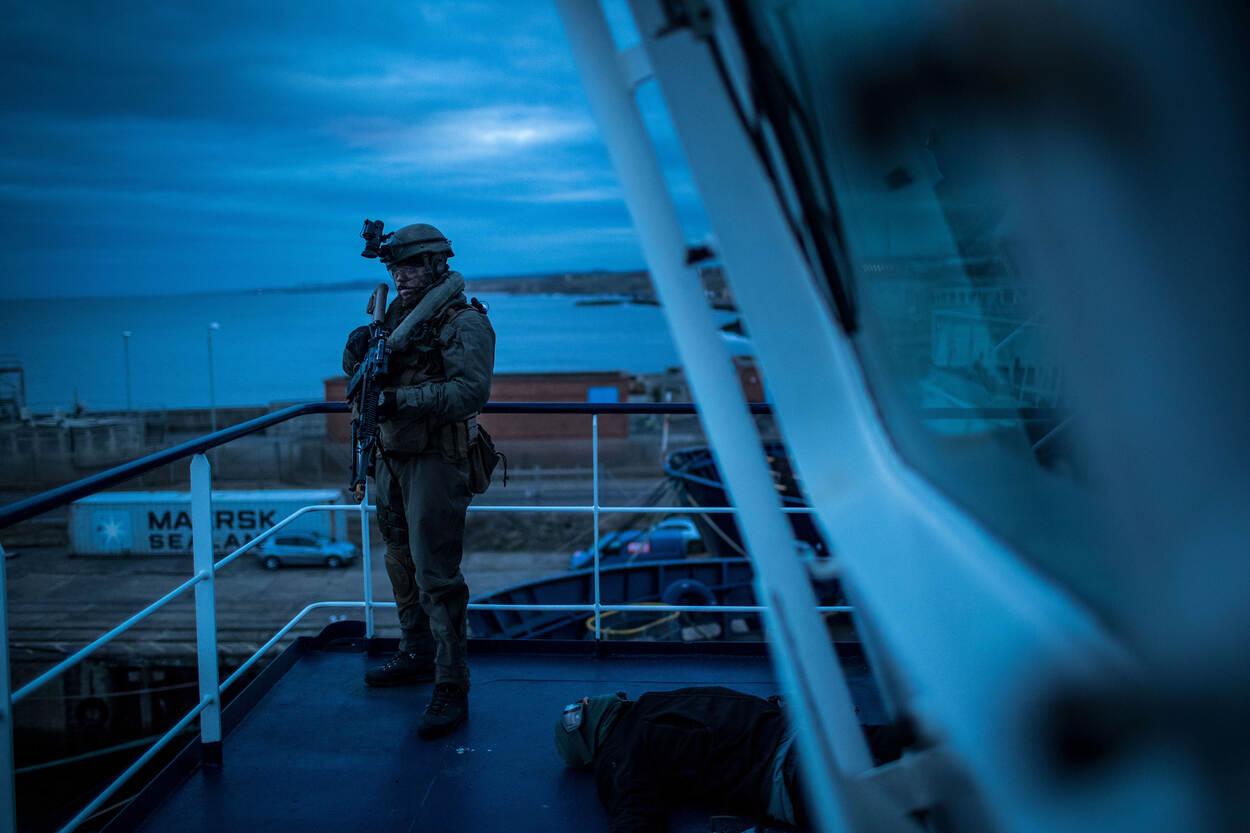 Nee, het zijn geen opnamen voor een film. Het is de certificeringsoefening van 21 Raiding Squadron. De militairen van het Korps Mariniers werkten hier al een jaar naar toe, tijdens zware bergtrainingen en oefeningen in ijskoude gebieden. En nu een scenario in Schotland, als ‘eindexamen’. De overheid van het fictieve land Pastonia roept internationale hulp in om wapensmokkelaars op te pakken en intel te verzamelen. Eerst op een vijandelijk schip, in de verlaten haven van Sunderland, daarna in 2 loodsen in Blyth.