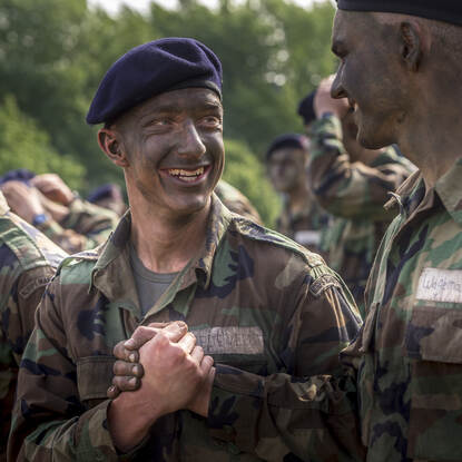 “Tijdens de EMV ligt de focus op persoonlijke vorming en het bijbrengen van individuele vaardigheden”, legt Maas uit. “De aansturing van kaderleden is dan strak en directief. Tijdens de EVO verschuift de aandacht naar het aanleren van vakinhoudelijke aspecten en het opereren binnen een sectie. De aansturing door kaderleden is hierbij veel meer gericht op coaching en begeleiding. De opleidingsbaret staat symbool voor de stap die mensen als persoon en militair maken, van de EMV naar de EVO. Door deze tussenstap verklein je ook de uiteindelijke afstand tussen de opleidingsfase en de plaatsing bij een operationele eenheid. Zelfstandigheid, initiatief en verantwoordelijkheid zijn dan namelijk al uitgebreid aan bod gekomen.”