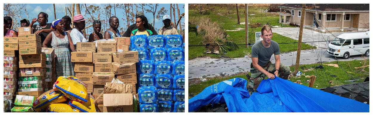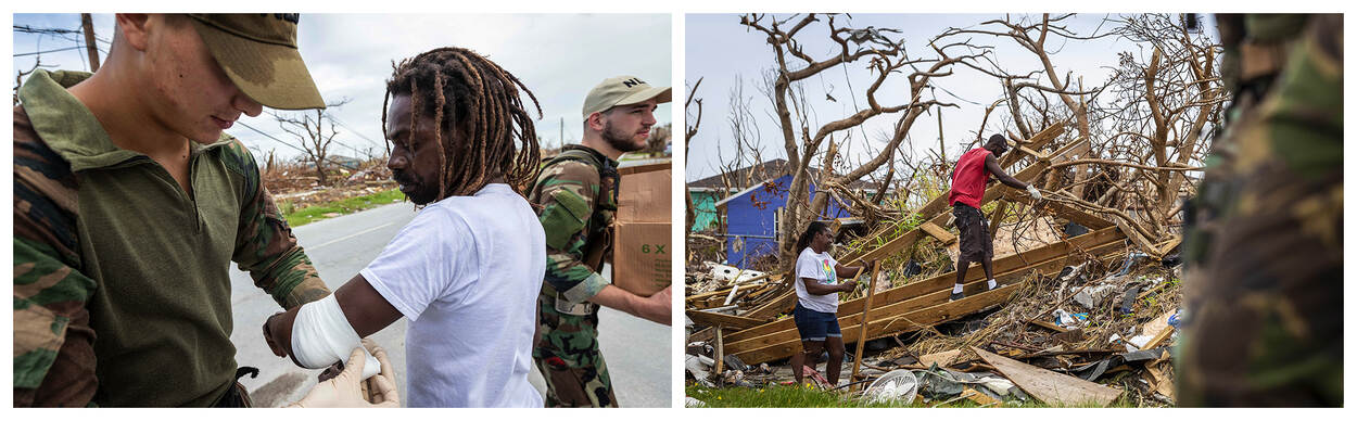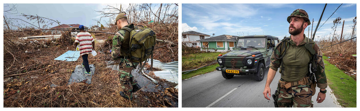 Aan land wachtten de puinhopen. “Marsh Harbour is een spookstad geworden”, zegt Frederick Brown, commander van de Bahamian Defence Force. Het tropische, groene eiland Abaco had ooit 17.000 inwoners. Duizenden zijn gevlucht, velen vermist. De straten van Marsh Harbour waren leeg en ook Murphy’s Town leek verlaten. Tot het moment dat mariniers van 21 Raiding Squadron toeterend door de straten reden. Een aantal dagen daarvoor werkten ze nog op de Wereldhavendagen in Rotterdam, maar nu hier, met 2 MB’s, volgens sergeant van de mariniers René ‘volgestouwd met spullen’. Water. Rijst. Koekjes. Zelfs tandenborstels. Op het geluid van de claxon doken tientallen gezichten op uit de chaos, die ooit een dorp voorstelde. Vlakbij de krottenwijk ‘The Farm’, waar de Nederlanders, Fransen en Duitsers samen water en voedsel distribueerden, was het niet anders. Een luidspreker kondigde de hulp aan en in no time stonden er weer hordes mensen rond de truck.