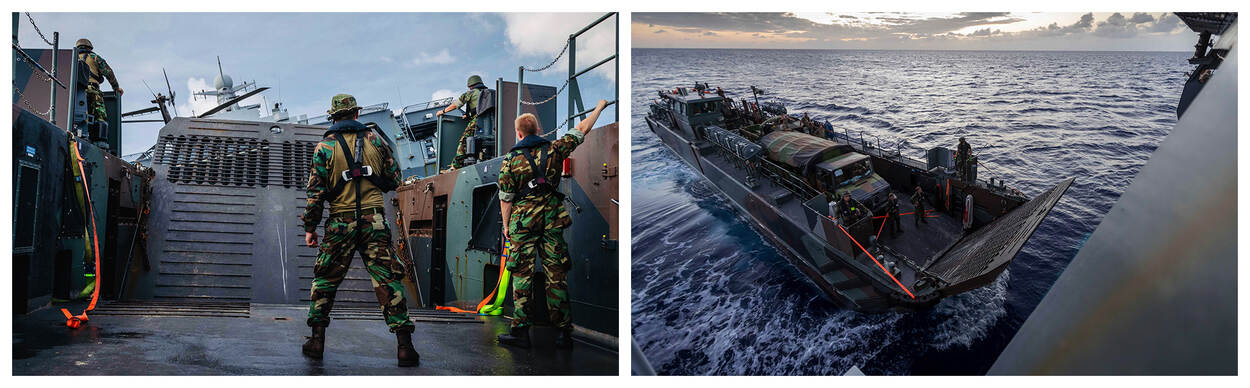 Dan was er ook nog het weer. Was orkaan ‘Dorian’ net weg, schurkte orkaan Humberto zich alweer tegen het gebied aan. De sterke wind zorgde voor een flinke deining op de oceaan. Zo heftig, dat LCVP’s, LCU’s en de FRISC niet meer heen en weer konden varen tussen het steunpunt op land en de Johan de Witt. “Daarom moesten we gaan voor plan B, bij ons vertrek van Abaco”, vertelt Van de Sande. De Amphibious Beach Unit zocht en vond vervolgens een geschikte plek, 80 kilometer verderop, aan de zuidzijde van het eiland, waar de deining minder sterk was. De Snellius stippelde een route uit, met genoeg diepgang voor de landingsvaartuigen. “Anders hadden we onze mensen, voertuigen en materialen niet terug kunnen halen.”