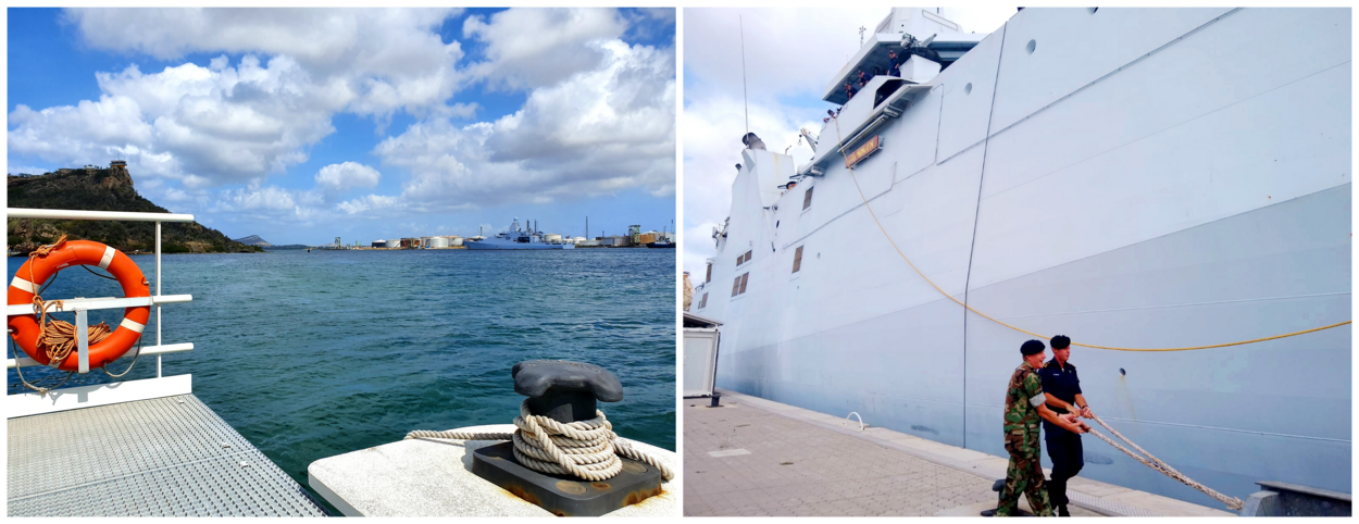 Een handjevol collega’s, onder wie CZMCARIB BRIGGENMARNS Peter Jan de Vin, stond maandagochtend op de steiger van Marinebasis Parera om Zr.Ms. Groningen een goeie terugreis te wensen. Met de aankomst van Zr.Ms. Zeeland in het Caribisch gebied kon de Groningen beginnen aan haar thuisreis over de Atlantische Oceaan. Samen met chef der equipage AOOODOPS Hans Hijman gooide De Vin een van de trossen los. “De tweejarige pilot van het concept van een wisselbemanning wordt onderbroken, maar ik zie het schip na haar onderhoudsperiode in Nederland weer snel in de West”, aldus de generaal.