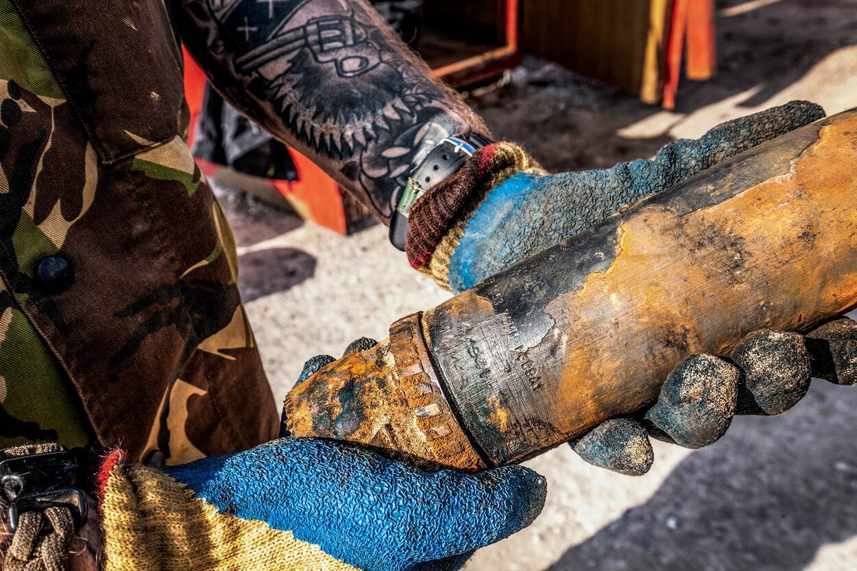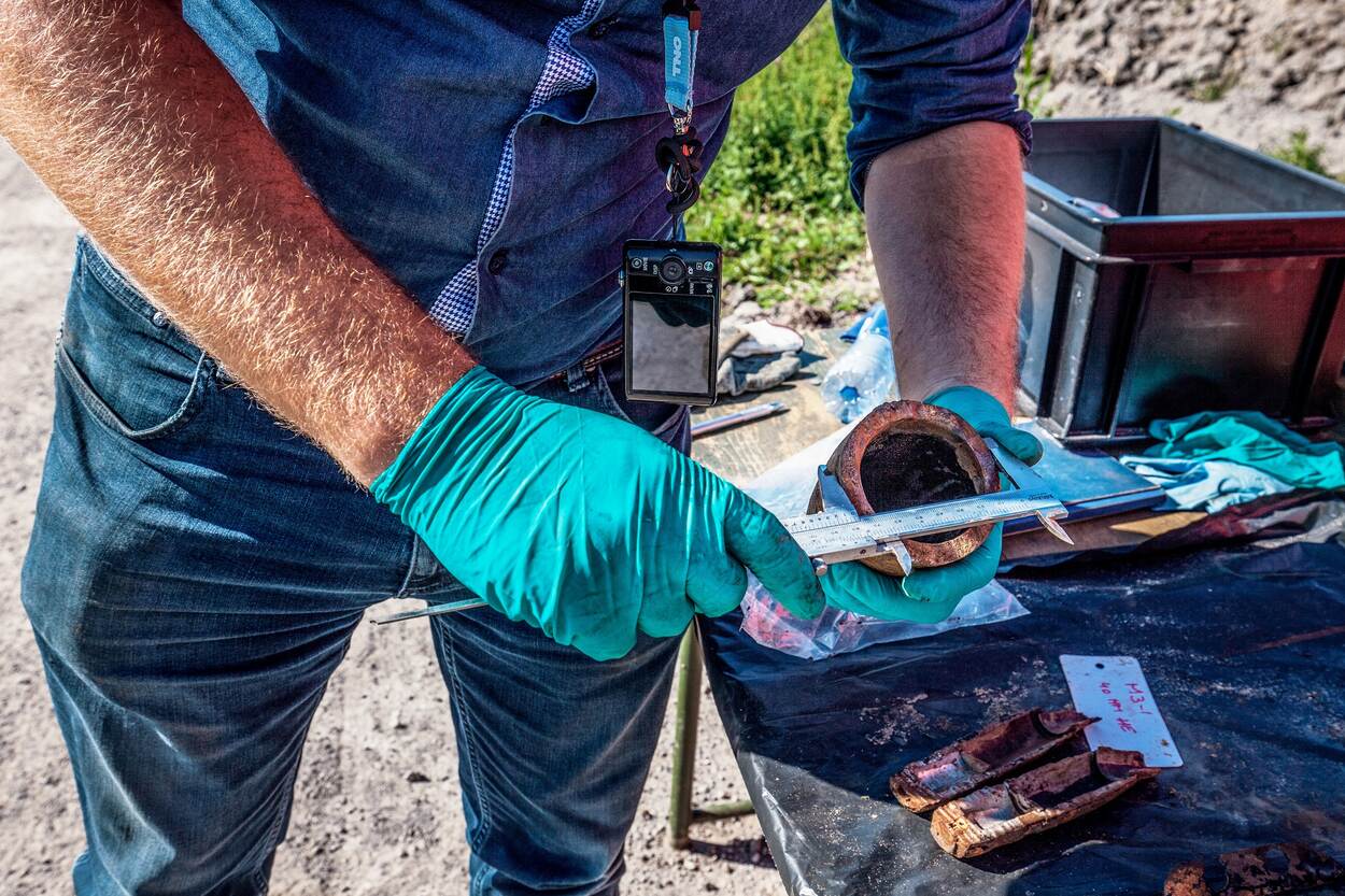 Zijn collega Olde meet op het baggerdepot met een schuifmaat de grootte van opgeviste munitie-onderdelen op. "In het begin van de duikperiode ging het door de storm een beetje moeilijk, maar daarna kwam er veel munitie naar boven. Mortiergranaten, artilleriegranaten, maar ook kardoezen met kruit. Hoe meer er naar boven komt, hoe beter onderbouwd de conclusies van het onderzoek zijn als het straks klaar is. We hebben een mooie doorsnee gekregen van wat er is gestort. De water- en slibmonsters worden nog onderzocht in een lab op munitie-gerelateerde stoffen en dan is het aan TNO om er een goed rapport van te maken."