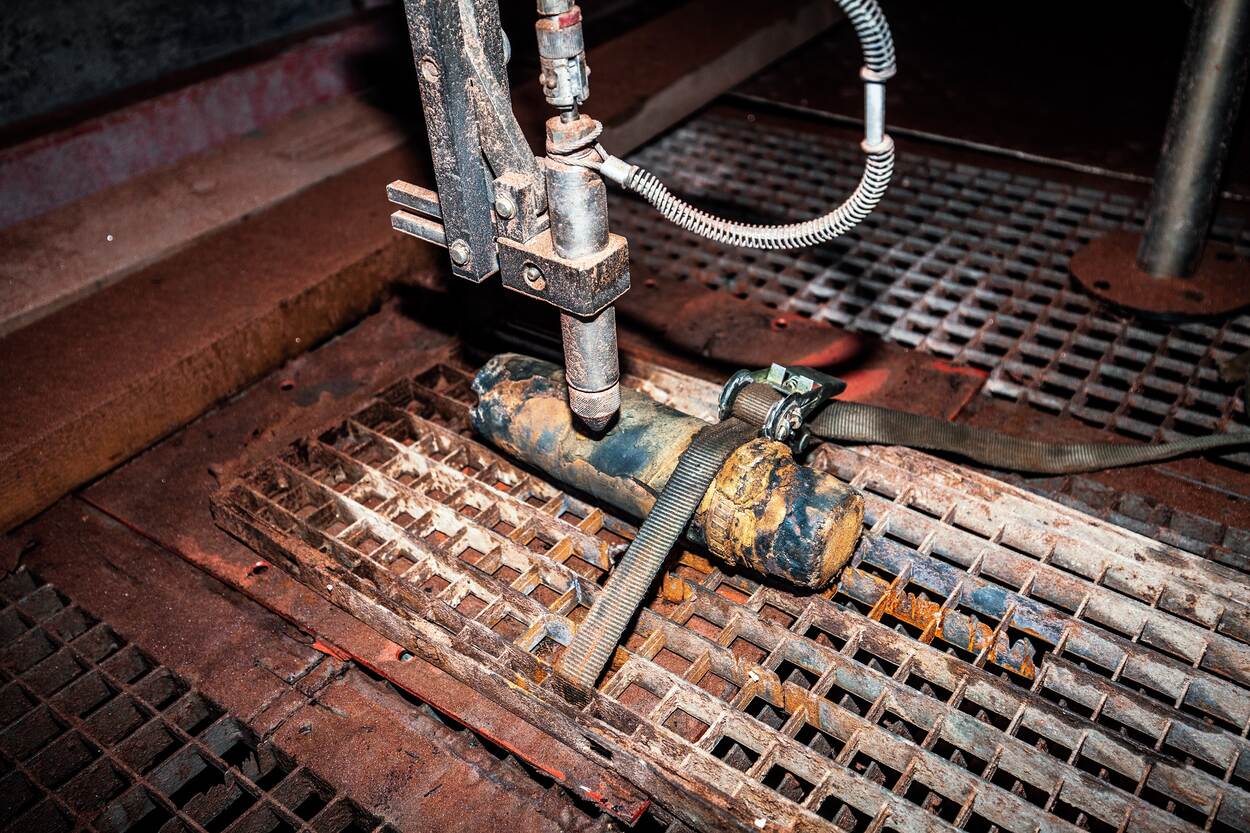 'Het apparaat spuit water, vermengd met een zeer fijn straalmiddel, onder een druk van 700 bar tegen de granaat'