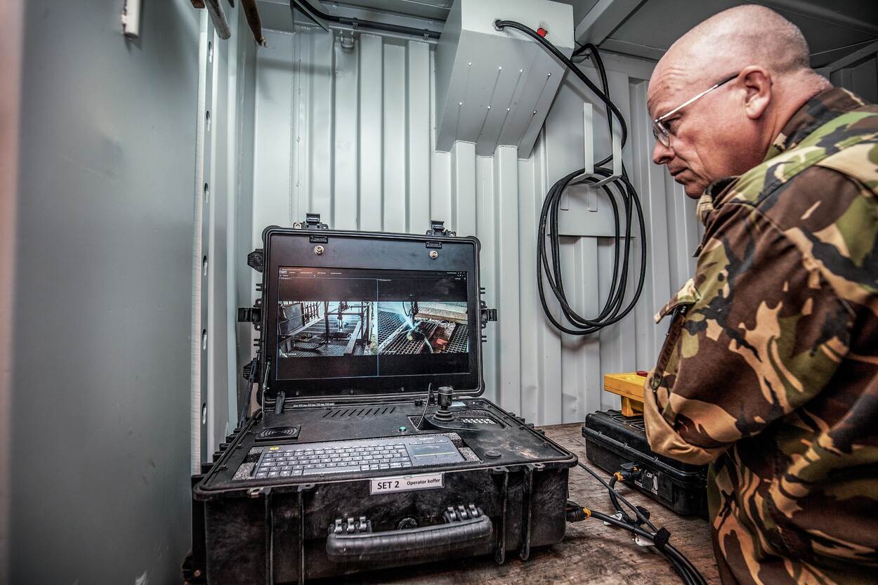 De relatieve stilte van de Zeeuwse polder wordt verstoord door een doffe knal. De grond van het baggerdepot trilt, gevolgd door een zandfontijn van enkele meters hoog. Sergeant-majoor Marc en zijn collega's hebben de dagopbrengst aan springstof uit de uit de Oosterschelde opgediepte munitie gecontroleerd laten ontploffen. Zij sluiten daarmee de werkzaamheden van die dag af. Een uurtje daarvoor was het scherpe geluid hoorbaar van de watersnijapparatuur, waarmee in de provisorische bunker een granaat in 2 stukken werd gezaagd. "Het apparaat spuit water, vermengd met een zeer fijn straalmiddel, onder een druk van 700 bar tegen de granaat. Het mondstuk heeft een opening van 0,6 millimeter", verduidelijkt hij. "Daarmee snijden we er in zo'n 10 minuten, afhankelijk van de granaat, doorheen. Vervolgens halen wij de springstof eruit en kan TNO aan het werk. Wij zijn een van de weinigen binnen Defensie die met watersnijapparatuur werken. Oorspronkelijk is de apparatuur aangekocht om ontstekers uit munitie te kunnen snijden, maar het is ook prima bruikbaar voor dit soort klussen."