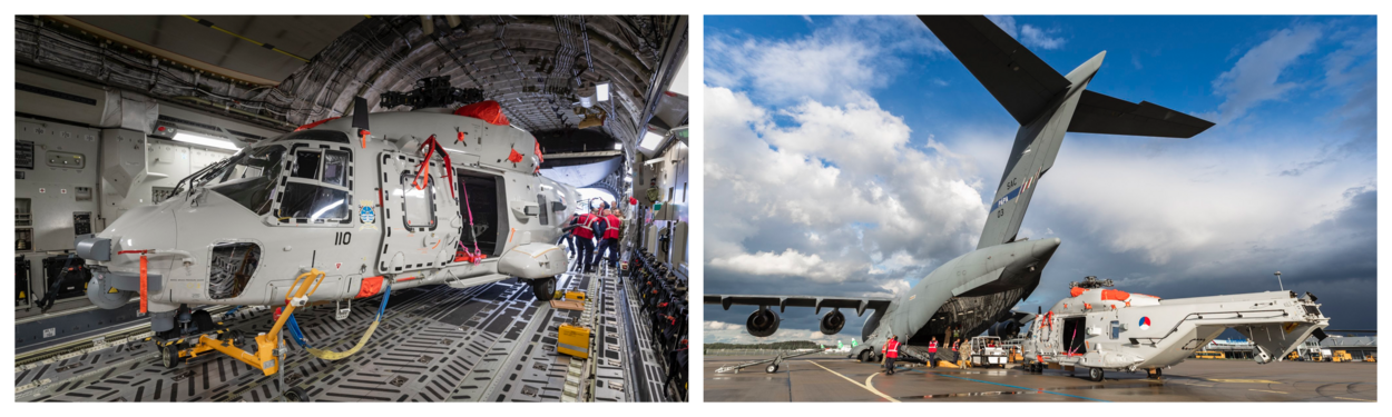 De NH90 vertrok van Vliegbasis Eindhoven per Amerikaans C-17-transportvliegtuig. Dat toestel is 1 van de 3 vliegtuigen van het gezamenlijke NAVO-programma Heavy Airlift Wing. Normaalgesproken vaart het toestel mee op het patrouillevaartuig dat naar het inzetgebied gaat, maar daar is vanwege de pilot met wisselbemanning van afgeweken.
