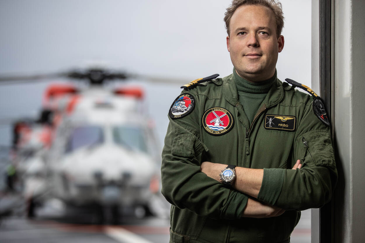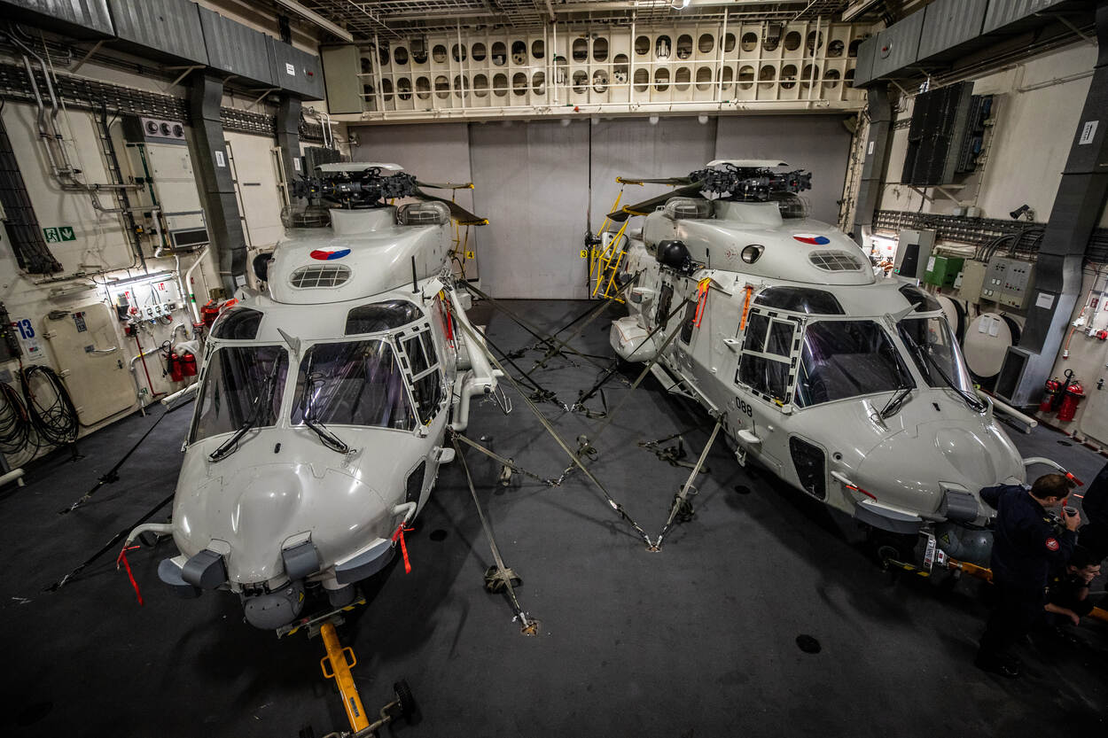 “Het schip is ervoor gebouwd, dus eigenlijk niet zo heel veel extra”, reageert het hoofd Operationele Dienst van Zr.Ms. Johan de Witt (HOD), luitenant ter zee 1 Ferdi Droste, nuchter. “Ook de samenstelling van bijvoorbeeld de commandocentrale is erop ingericht; 2 aircontrollers begeleiden de kisten. Ook in logistiek opzicht is er genoeg ruimte om extra zaken op te bergen. De rotorbladen en staarten van de heli’s moeten weliswaar ‘gevouwen’ worden, maar dat is geen probleem.”