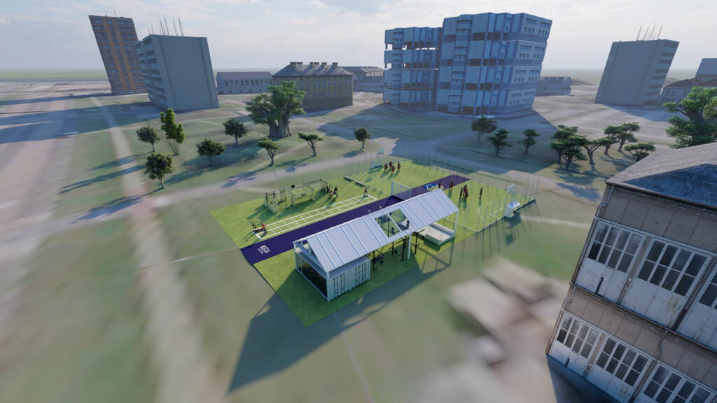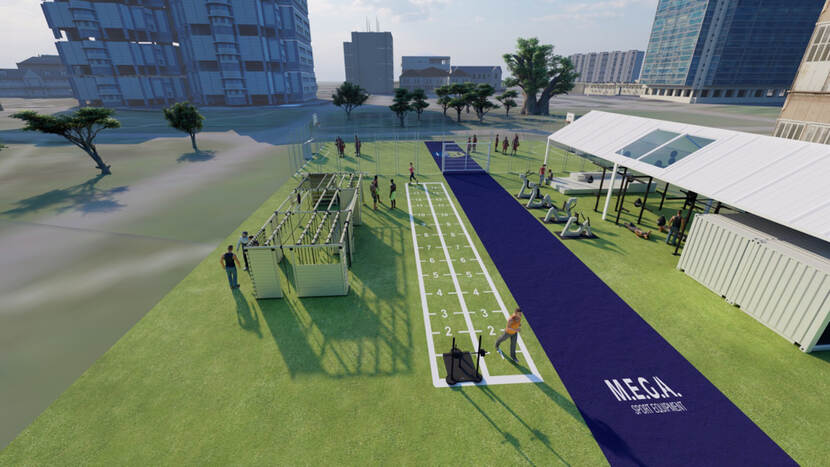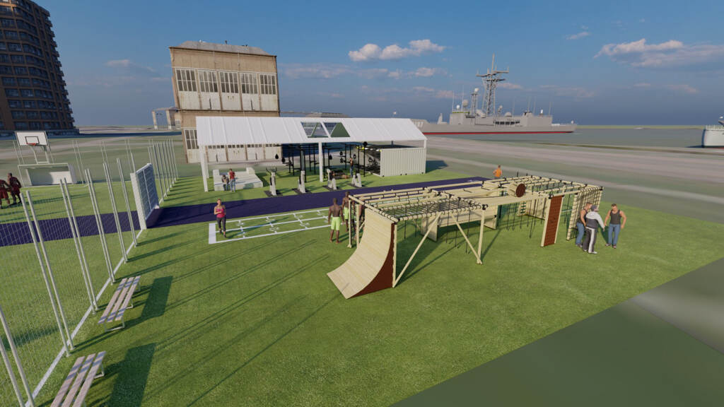 Het playcourt omvat ook een survival box met klimtouwen. Daarin kunnen eveneens functionele militaire trainingen worden ondernomen. In een overdekt gedeelte staat een zogeheten HITT-container voor krachttrainingen en hangen met water gevulde bokszakken. “Het is een divers complex waarop je bijna alle sporten kunt bedrijven”, vertelt initiatiefnemer majoor der mariniers Erwin Maarhuis, senior-adviseur van de staf Fysieke Training & Sport (FS&T) van het CZSK. Ook belangrijk: langs het court komt een soort ‘hangplek’ voor toeschouwers. “Hopelijk stimuleert dit mensen die komen kijken om ook te gaan sporten”, legt Maarhuis uit.