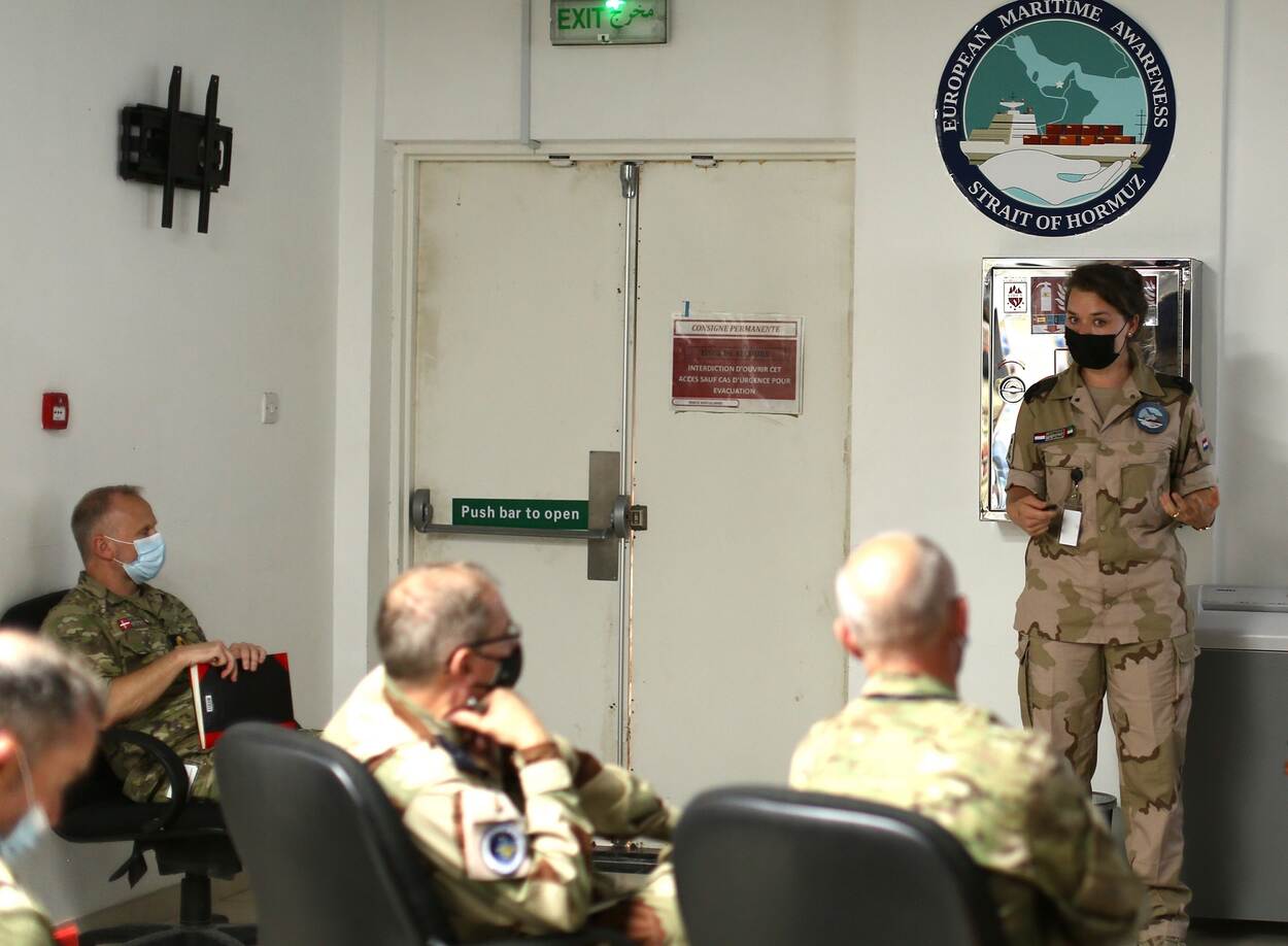 “Hoewel corona ons flink in de weg zit, probeer ik ook – zo goed en zo kwaad als dat gaat – om zogenoemde key leader engagements op te zetten”, vervolgt Leonoor. “Dat is vooral om belangrijke partijen in de omgeving een duidelijke boodschap over te brengen. We zijn hier hard aan het werk om een veilige doorgang in de Straat van Hormuz te bewerkstelligen, door middel van surveillance, aanwezigheid en de-escalatie, ook om zo de regionale stabiliteit te versterken. Heel belangrijk om dat naar buiten toe te blijven uitstralen. Aangezien het in deze missie nadrukkelijk gaat om de zichtbare aanwezigheid van onze eenheden, is ook stratcom een belangrijke pilaar. We moeten op alle manieren laten zien dat we er zijn.”