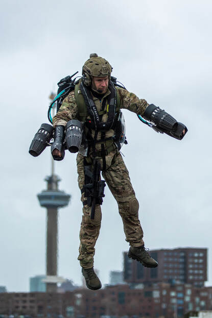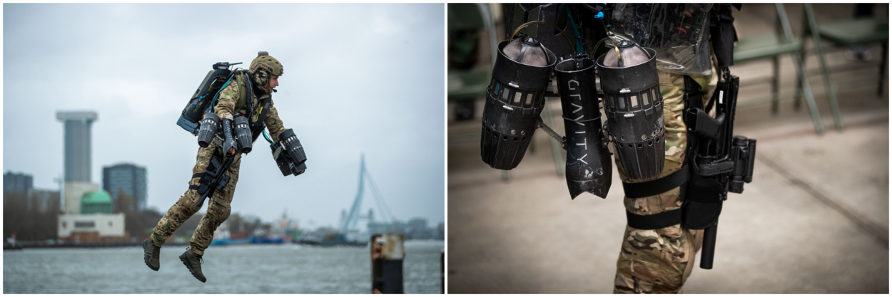 Niemand kon een paar weken geleden om het filmpje heen. Een marinier vliegt tijdens de oefening Port Defender à la James Bond vliegensvlug van een schip naar een schip om te enteren. Maar sinds Sean Connery in 1965 met het vliegpak aan zijn vijand wist te ontkomen, is de uitvinding behoorlijk doorontwikkeld. Op de rug en de armen zitten motoren. De drager kan snelheid en opwaartse druk regelen met een gashendel in de hand. Door lichaam en armen te bewegen, kan hij alle kanten op.