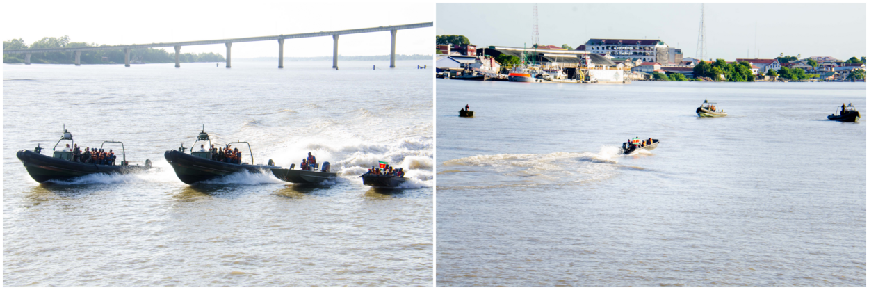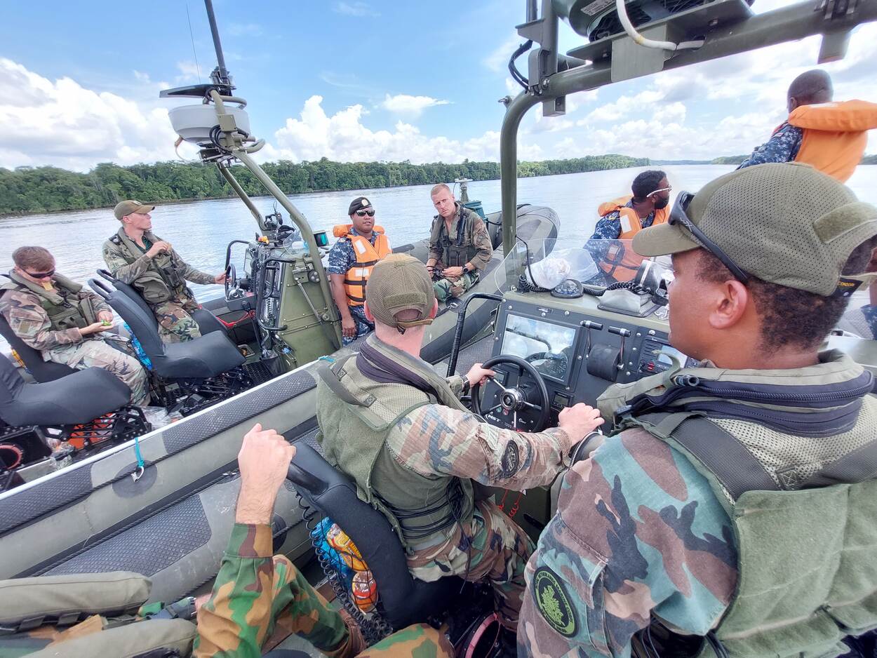 De Suriname Rivier is de uitvalsbasis van het Korps Mariniers Suriname, vertelt pelotonscommandant eerste-luitenant Pique, terwijl hij als passagier op een FRISC over de rivier scheert. “We zijn hier regelmatig te vinden. Maar boten als de FRISC’s zul je bij ons niet vinden. Wij hebben enkel kleinere patrouilleboten. Onze eenheid is nog heel jong; we zijn opgericht in 2017 en bestaan uit 3 pelotons. We voeren patrouilles uit, maar het ondersteunen van de politiedienst is ook een van onze taken. Zo patrouilleerden we in de straten tijdens de lockdown vanwege corona.”