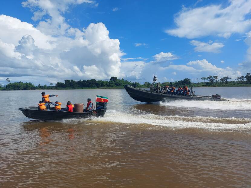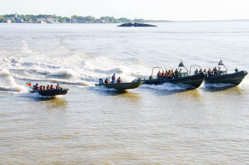 Op het programma tijdens deze eerste gezamenlijke vaartocht: rivierverkenningen met marine-infanteristen van het Surinaams Nationaal Leger en de Surinaamse Kustwacht. Meer samenwerken is de hoofdmoot. “Voor nu betekent dat vooral formatievaren”, vertelt korporaal van de mariniers Van Gent vanaf zijn FRISC. “We nemen 2 dagen lang een kijkje in elkaars keuken. Socializen, elkaar leren kennen en ervaring in deze omgeving opdoen.”