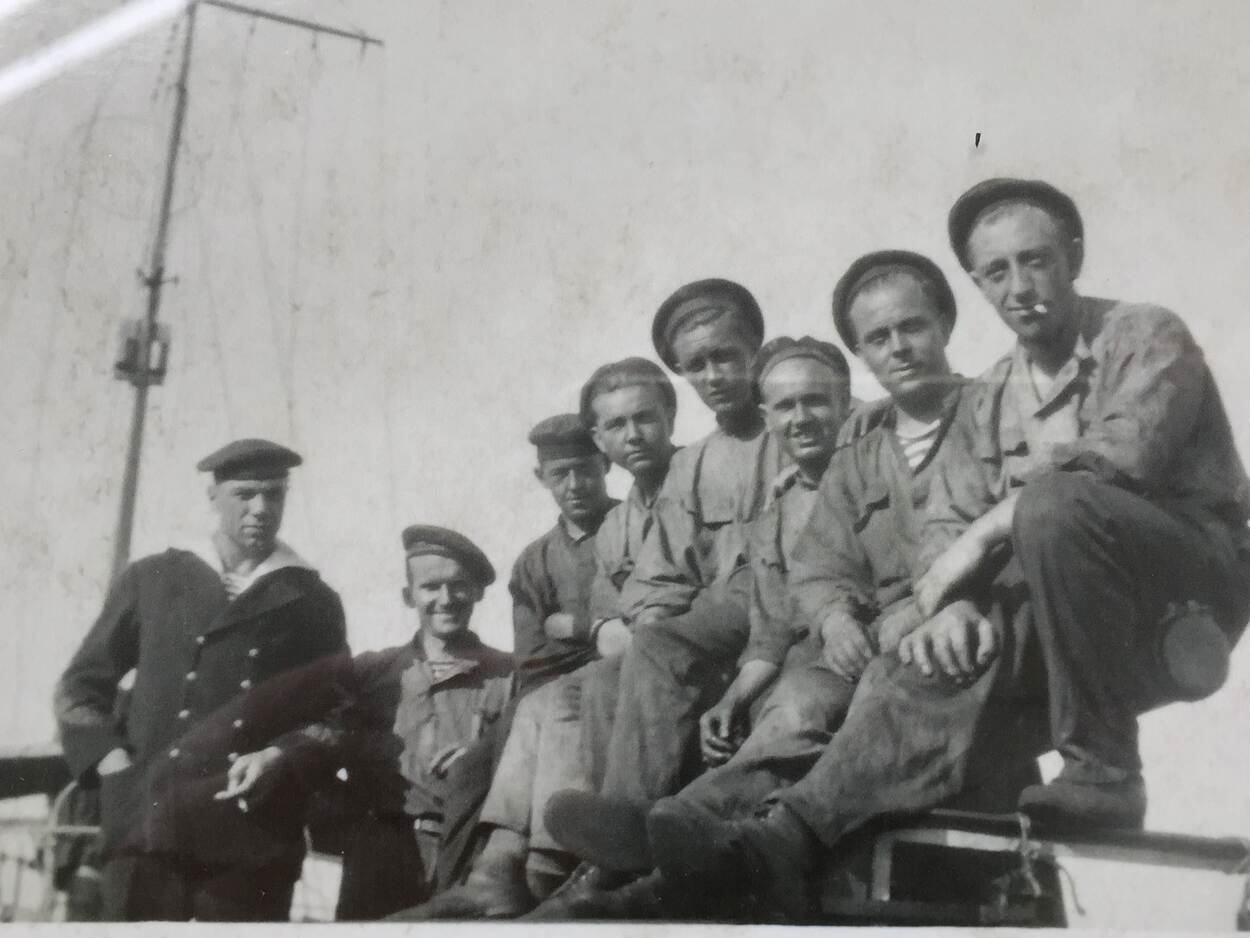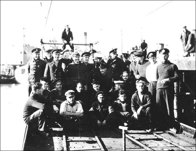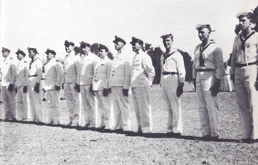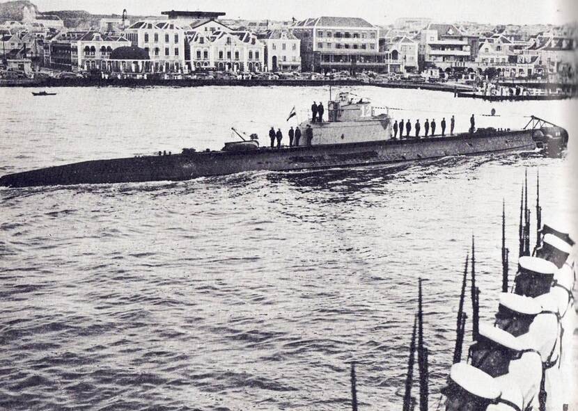 Bemanning van de O19 bij aankomst in Falmouth, februari 1943. Zittend van links naar rechts: sergeant-machinist Janus (D.A.) van Duyn, matroos 3 A.C. ten Bosch, korporaal-machinist J.A. Samson, bootsman Roel Vliegen, korporaal-torpedomaker R.F. Wattimena, stoker-olieman A. de Bont, korporaal-machinist Lekatompetty, sergeant-machinist Pieter de Groot (niet zeker; origineel fotobijschrift spreekt van ‘monteur met witte pet’), matroos-hofmeester Sikoes, korporaal-telegrafist Arie Breedveld, sergeant-machinist Karel van Dijk. Bovenaan: seiner Bil (M.) de Corver, majoor-monteur A.L.M. den Haan, matroos 1 W. Verwey, sergeant-telegrafist H. Zweistra, matroos 1 W.J. Meijnesz, matroos 1 Hannes Wever, commandant luitenant ter zee 1 Hendrik Bach Kolling, majoor-machinist Rinus Glazema, sergeant-machinist J.C. Marckelbach, eerste-officier lluitenant ter zee 2 A. van Altena, schipper B.J. Starink, majoor-torpedomaker Harry Sigon, sergeant-torpedomaker W. Snel, korporaal-monteur Dolf Klein, luitenant ter zee 1 T.A. Vos (MSD), Engels verbindingsofficier met witte trui en luitenant ter zee 2 H.M. van der Veen. (Bron: ‘Monografie Onderzeeboten-O19’, Gerard Horneman)