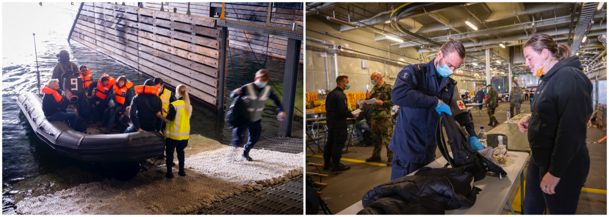 1 voor 1 varen de rubberen bootjes het dock van het schip binnen. Bemanningsleden helpen evacués van boord en verwijzen hen door naar collega’s die de opstappers fouilleren. De bagage wordt, voor de derde keer die dag, grondig geïnspecteerd. Daarna worden zij geregistreerd en volgen zij verplicht een veiligheidsbriefing. Het is aanschuiven aan de lange picknicktafels op het voertuigendek, waar voor iedereen koffie, thee en wat lekkers is. “Als de nood hoog is en Buitenlandse Zaken het zou vragen, kunnen we natuurlijk veel meer mensen kwijt; dan zetten we alles op alles”, benadrukt Schipper.