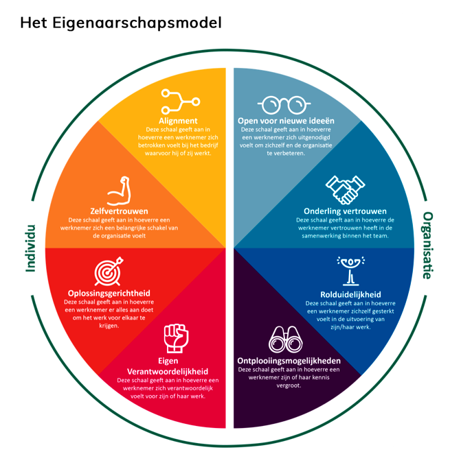 Tijdens haar studie raakte Jonker geïnspireerd door senior research consultant Ester Koot van het Amsterdamse onderzoeksbureau Motivaction. “Zij deed uitgebreid onderzoek onder experts, leidinggevenden en circa 1.000 werknemers en heeft aan de hand daarvan 8 factoren bepaald die van invloed zijn op dit eigenaarschap*. Deze factoren zijn: alignment; zelfvertrouwen; oplossingsgerichtheid; eigen verantwoordelijkheid; open voor nieuwe ideeën; onderling vertrouwen; rolduidelijkheid; en ontplooiingsmogelijkheden.” (Zie weergave in Eigenaarsmodel, red.)