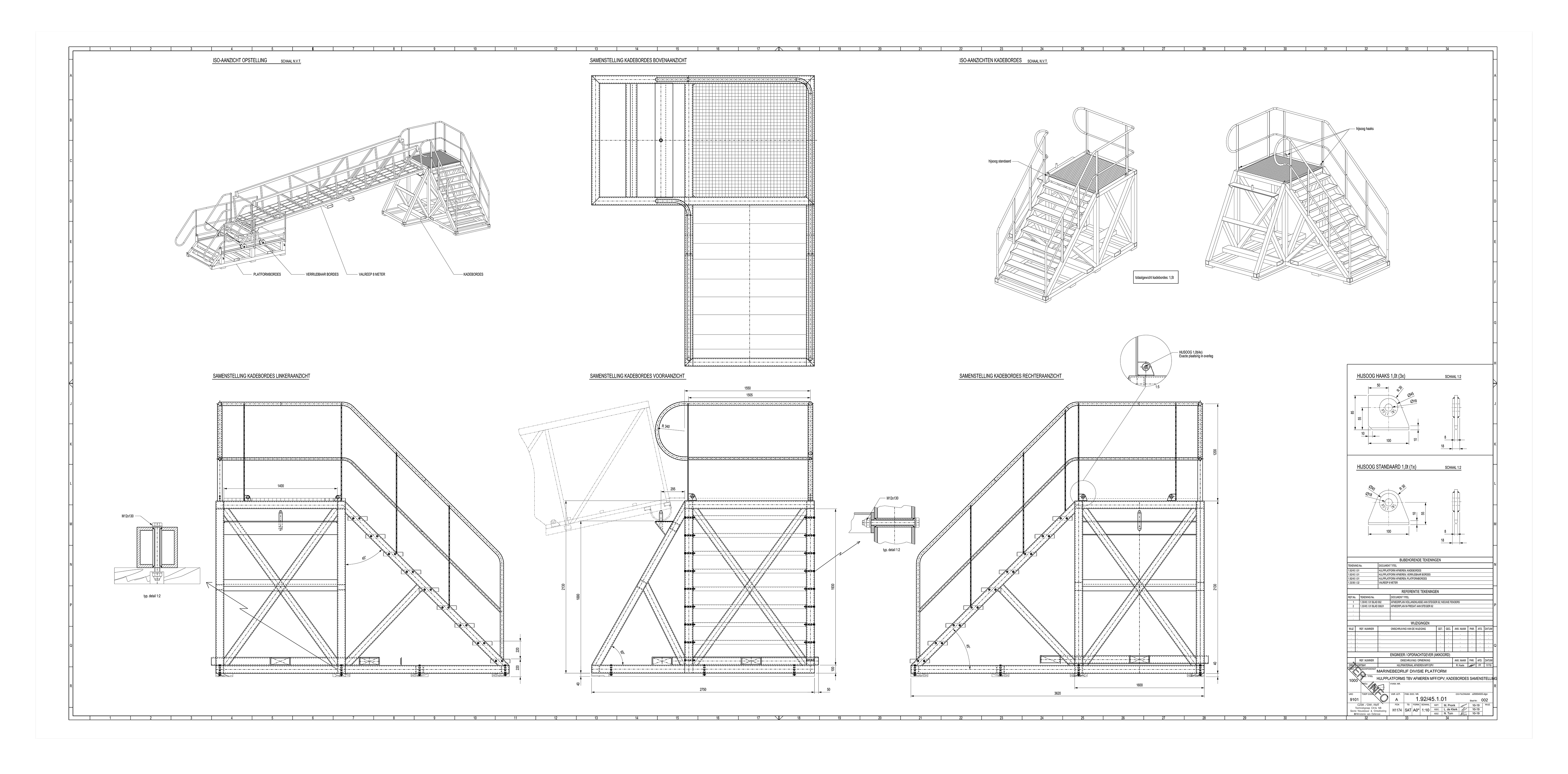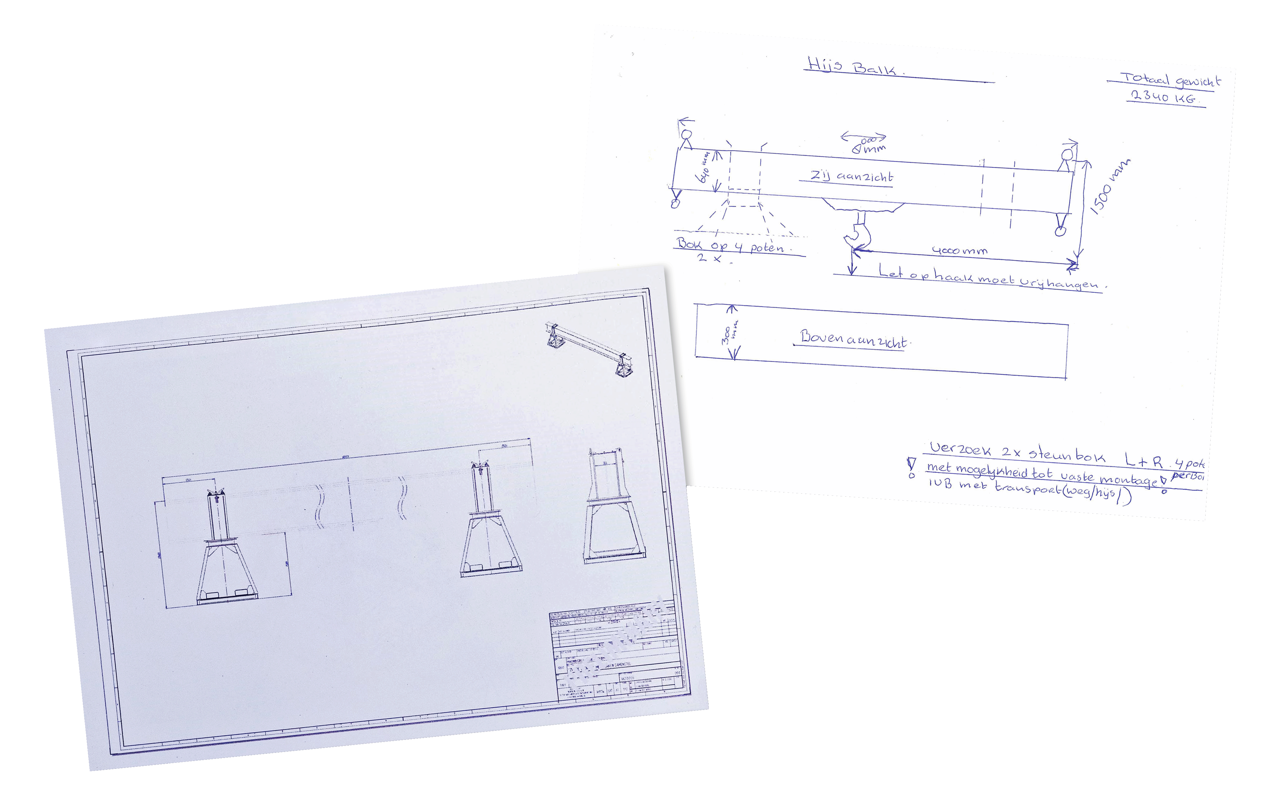 Legt het Constructiebureau zich voornamelijk toe op typische scheepszaken, ook het vervaardigen van allerlei exoten gaat hij niet uit de weg. Zo ontwierp Jos voor de afdeling Transport van DMI 2 bokken om een hijsbalk van tweeënhalve ton veilig per trailer te kunnen vervoeren. Daarvoor was het nodig om bij het berekenen van de massa-reactiekrachten de NEN-EN-normen voor het vrachtvervoer aan te houden. “Op het moment dat de vrachtwagen remt of een bocht neemt, treden er G-krachten op, die de belasting op de bokken beïnvloeden. Daarmee moet je bij het ontwerpen van de constructie wel rekening houden.”