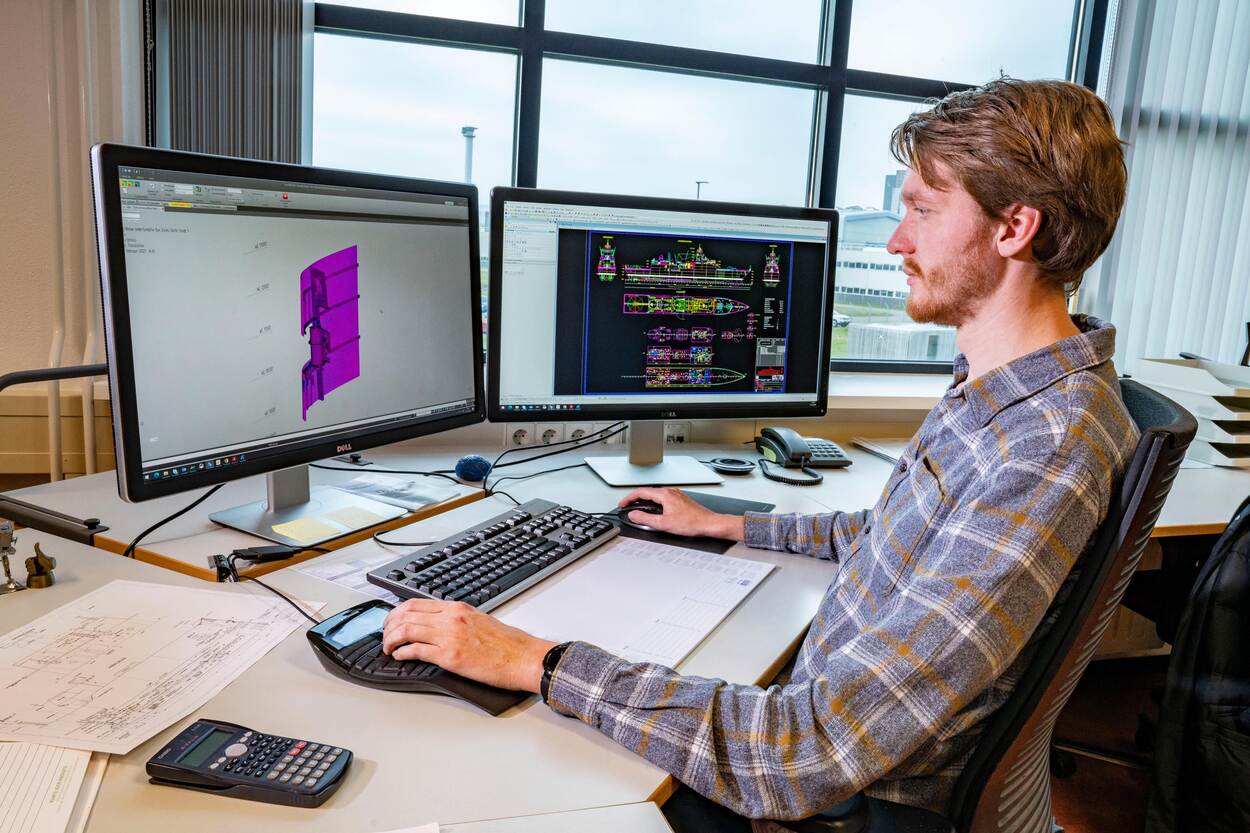 Het Constructiebureau bestaat uit een mix van ouder en jong personeel. Constructeur Joris van der Burg werkt pas 4 jaar ‘bij de baas’. Maar het voelt naar zijn zeggen als veel langer. Dat komt door zijn ouders, die beiden jarenlang bij de marine in Den Helder werkten. Technisch werk had vanwege zijn afgeronde HBO-opleiding Werktuigbouw zijn interesse. “En tekenen vond ik als kind al leuk. In dit werk kun ik beide mooi combineren.”