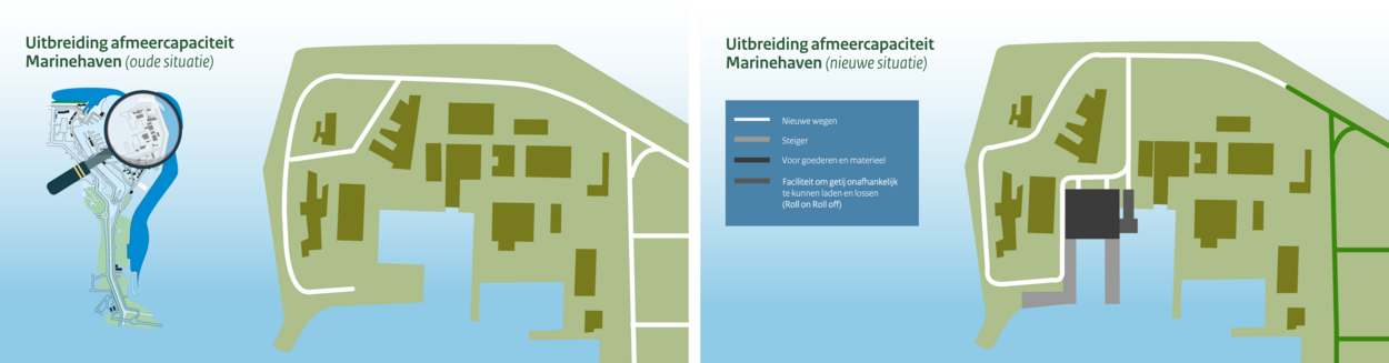 De nieuwe afmeervoorzieningen komen in de Berghaven aan de noordoostkant van de Nieuwe Haven. Qua lengte gaat het in totaal om 750 meter extra kade. Hiervan is 300 meter geschikt voor fregatten, Landing Platform Docks, het Joint Support Ship en het nieuwe CSS. Driemaal 150 meter aan nieuwe kaderuimte is bestemd voor mijnenbestrijdingsvaartuigen, M-fregatten en Ocean-going Patrol Vessels.