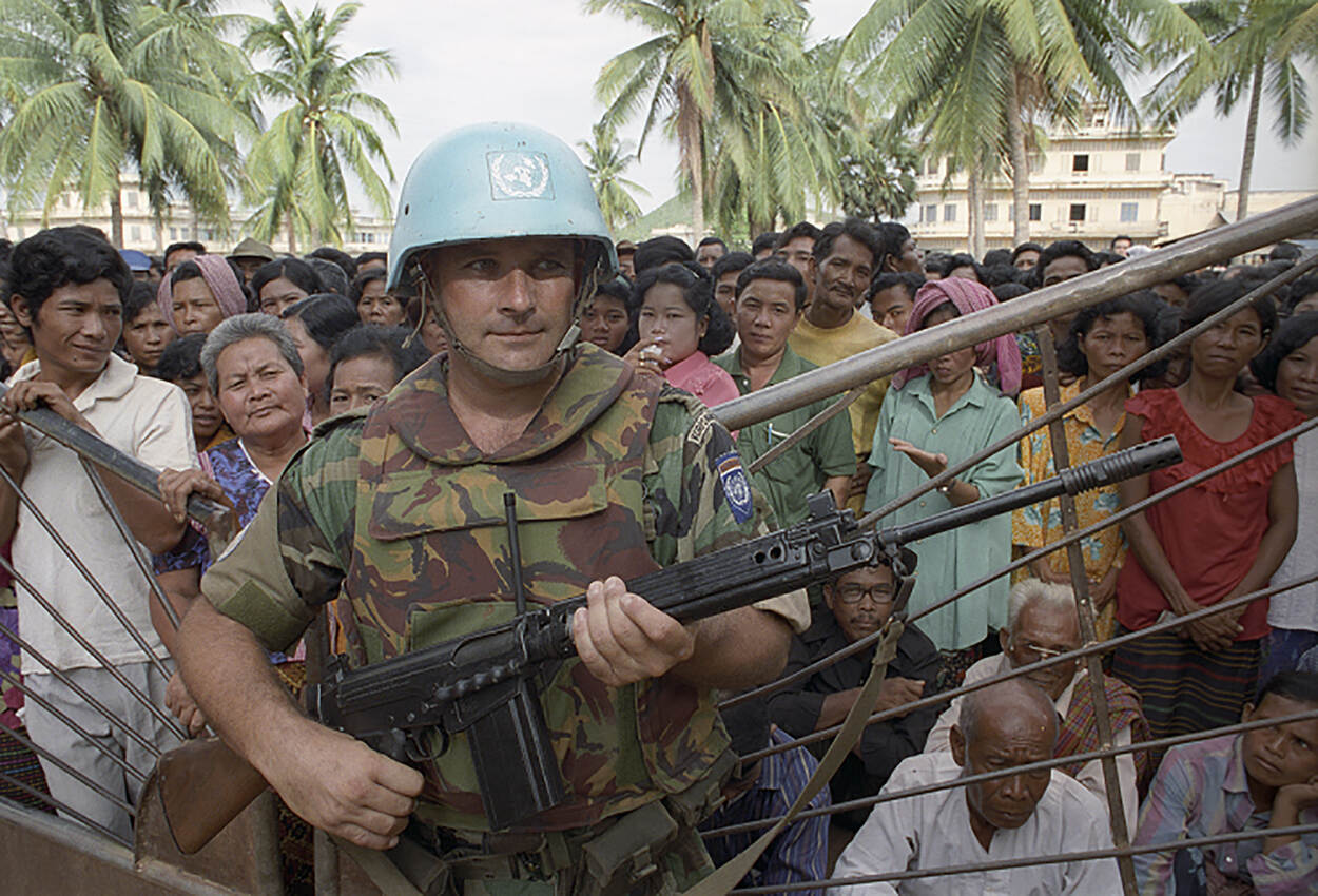 “In 1992 en 1993 speelde de KM wel een hoofdrol binnen een belangrijke internationale missie”, vervolgt Van Gils. “Dat was onder VN-vlag in Cambodja. Nederland ging in eerste instantie akkoord met de deelname van 27 militairen aan de United Nations Advance Mission in Cambodia (UNAMIC). Deze missie moest het gigantische mijnenprobleem in het Aziatische land aanpakken.” UNAMIC ging al snel op in UNTAC (United Nations Transitional Authority in Cambodia). Hiervoor werd flink uitgepakt. De Nederlandse bijdrage bestond uit een versterkt bataljon van het Korps Mariniers, van ongeveer 800 personen. Zij kregen de beschikking over 3 transportvliegtuigen van het type F-27 Troopship en 3 Alouette III-helikopters, met ongeveer 70 man ondersteunend personeel.