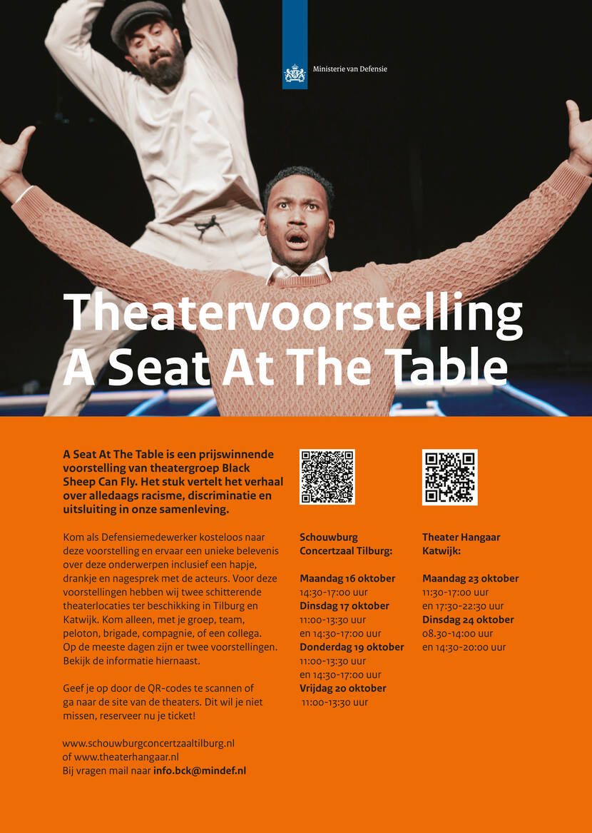 A Seat At The Table is een prijswinnende voorstelling van theatergroep Black Sheep Can Fly. Het stuk vertelt het verhaal over alledaags racisme, discriminatie en uitsluiting in onze samenleving. Klik op de poster voor meer info.