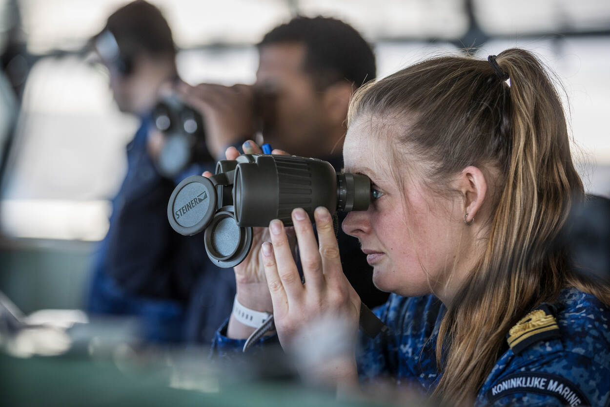 Op de brug van het schip tuurt matroos 1 ODOPS Xander met een verrekijker naar buiten. Hij houdt alles in de gaten wat er aan stuurboordzijde van het schip gebeurt. “Het is leuk om te doen waar je voor bent opgeleid”, zegt hij. De eerste aanval is inmiddels afgeslagen, maar de volgende dreiging is alweer in aantocht. “273, 20 mijl. Nog niets visueel”, deelt hij mee richting de officier van de wacht.