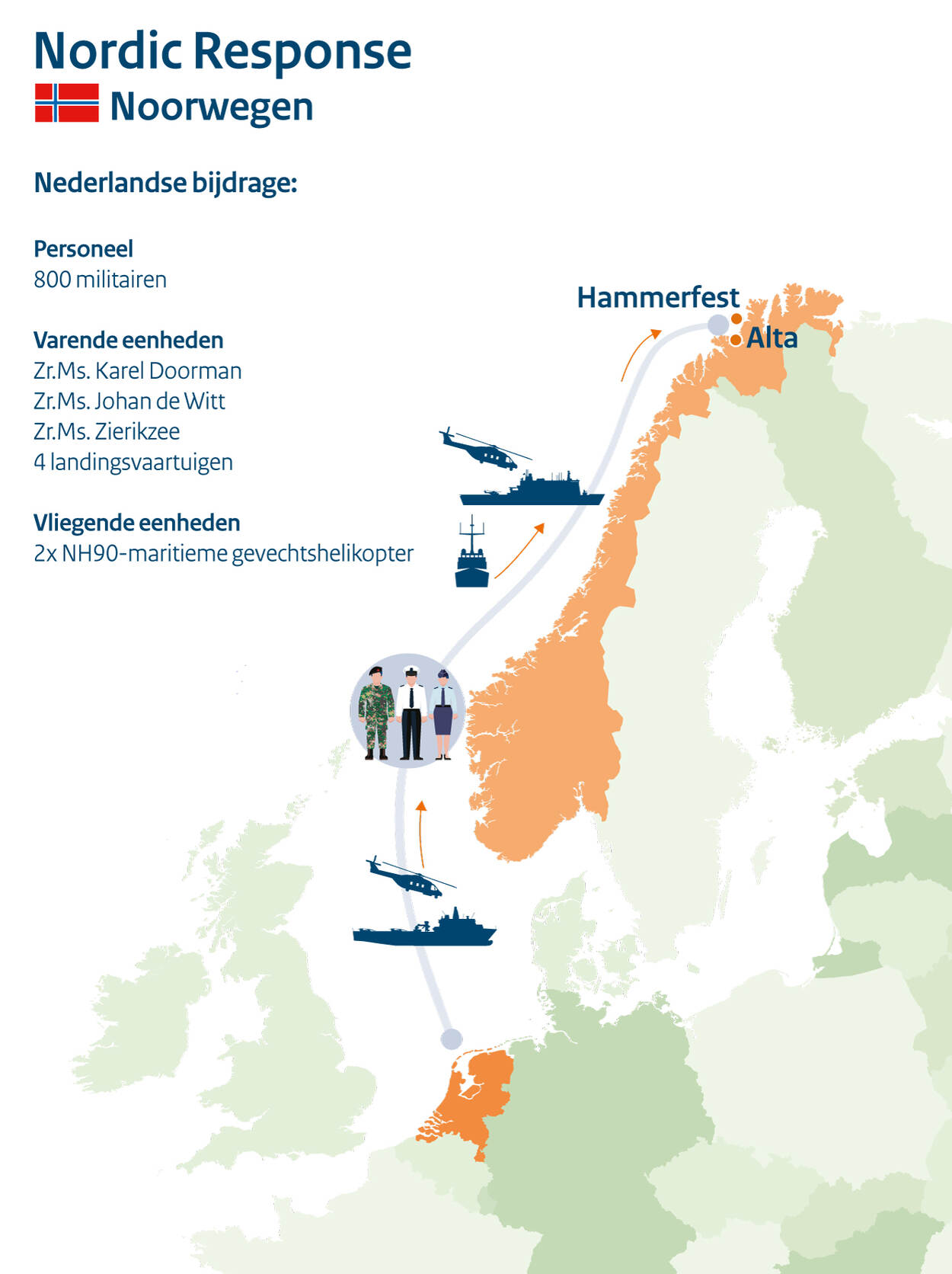 De amfibische landingen en dagenlange oefenstrijd in het noordelijkste puntje van Noorwegen staan niet op zichzelf. Ze vallen onder de NAVO-oefening Nordic Response. Nederland levert 800 militairen en meerdere schepen. Ook de Defensie Duikgroep is present. De Nederlanders zijn in het goede gezelschap van 19.000 militairen en tientallen oorlogsschepen en gevechtsvliegtuigen van bondgenoten. De oefening loopt tot eind maart. Nordic Response is onderdeel van Steadfast Defender, de grootste NAVO-oefening sinds de Koude Oorlog. Tot en met mei doen hier 90.000 militairen uit werkelijk alle NAVO-landen aan mee.