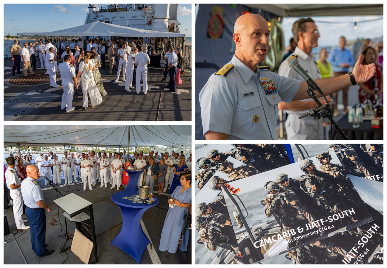Ruim 7.000 kilometer van Den Helder, tussen de palmbomen, wappert ook een Nederlandse vlag. Dat de viering van dit jubileum in het meest zuidelijke puntje van de Amerikaanse staat Florida plaatsvindt, is geen toeval. Daar bevindt zich namelijk het hoofdkwartier van de Joint Inter Agency Task force South (JIATF-S). Een unieke organisatie, waarin 20 landen en 13 organisaties, zoals ook de FBI en DEA samen strijden tegen druggerelateerde criminaliteit. Ook in het Caribisch Gebied.