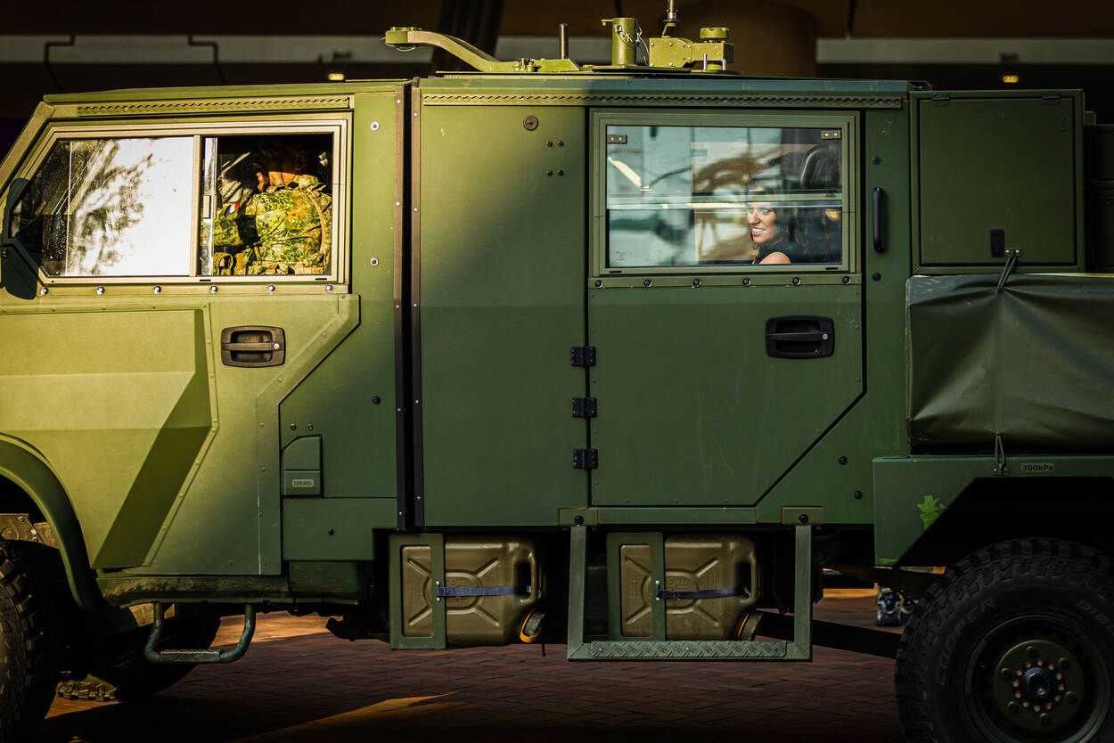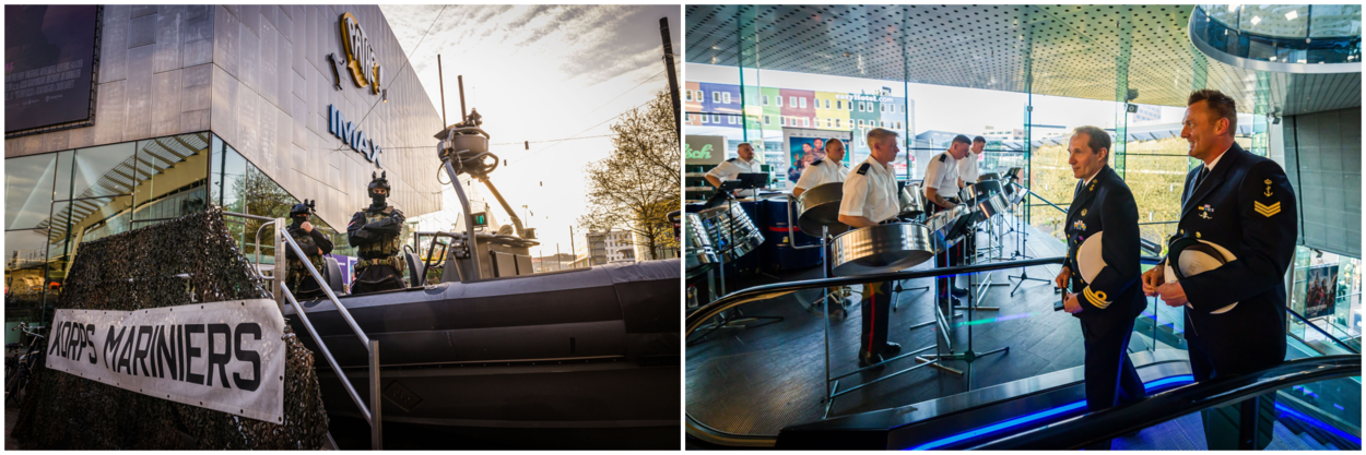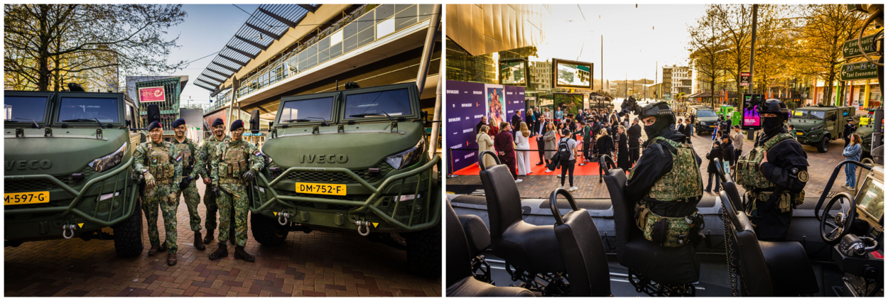 Voor de bioscoop zijn vóór aanvang van de eerste officiële vertoning 2 Anaconda’s de grote trekpleisters. De voertuigen rijden af en aan met het sterrenensemble van ‘Invasie’. Een kolfje naar de hand van de mariniers 1 algemeen Nino, Alex, Tigo en Damien. Van een afstand kijken ze later toe, want een plaatsje in een van de zalen zit er vandaag niet in. “We mogen met een hele club donderdag gaan kijken in Amersfoort, dus het komt helemaal goed”, zegt Nino, terwijl de ene na de andere (al dan niet) 'Bekende Nederlander' met hen op de foto gaat.