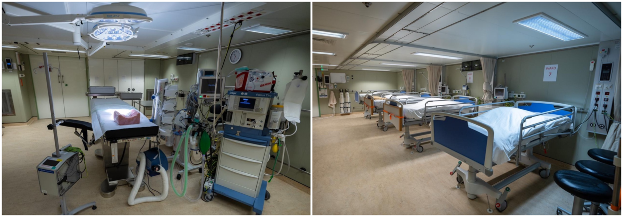 “Dit is onze grootste maritieme Role 2-inzet ooit. De Karel Doorman heeft vergeleken met andere marineschepen een enorm medisch complex. Wat dat betreft worden we ontzettend verwend. We beschikken over 4 Spoedeisende Hulp (SEH)-bedden, 2 operatiekamers en 15 verpleegbedden, waarvan 5 voor intensive care (IC). Daarnaast hebben we de mogelijkheid om röntgenfoto’s te maken.”