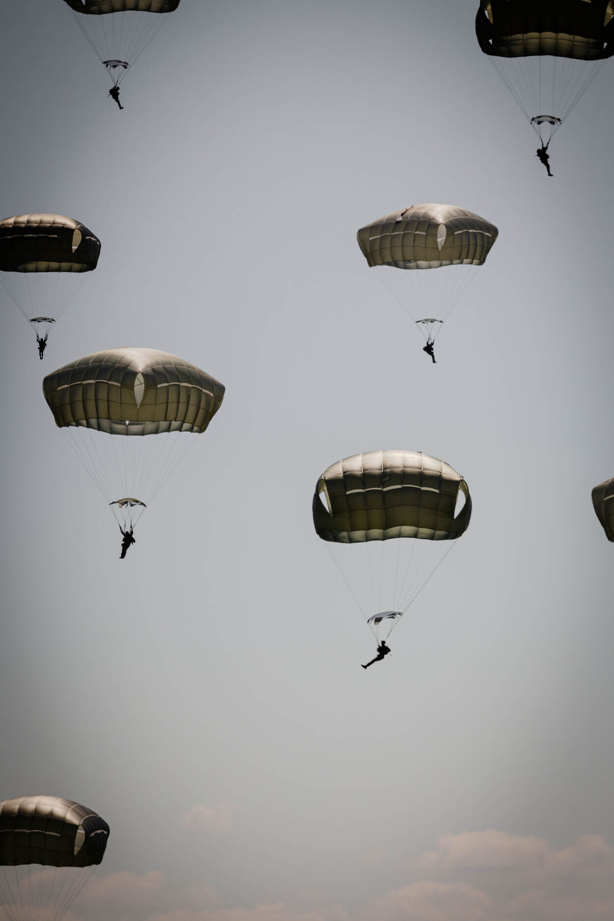 24 uur na het afronden van hun training heeft zich een menigte van vele duizenden toeschouwers verzameld rondom de dropzone bij Sainte-Mère-Eglise. Ze zijn daar zojuist getuige geweest van een groep ‘historische springers’, uitgedost in Tweede Wereldoorlog-uniformen, met logo’s van de destijds springende Amerikaanse 101st Airborne Division, als de speaker omroept dat de volgende wave arriveert. “ De C-130’s zijn al in de lucht”, kondigt hij aan.