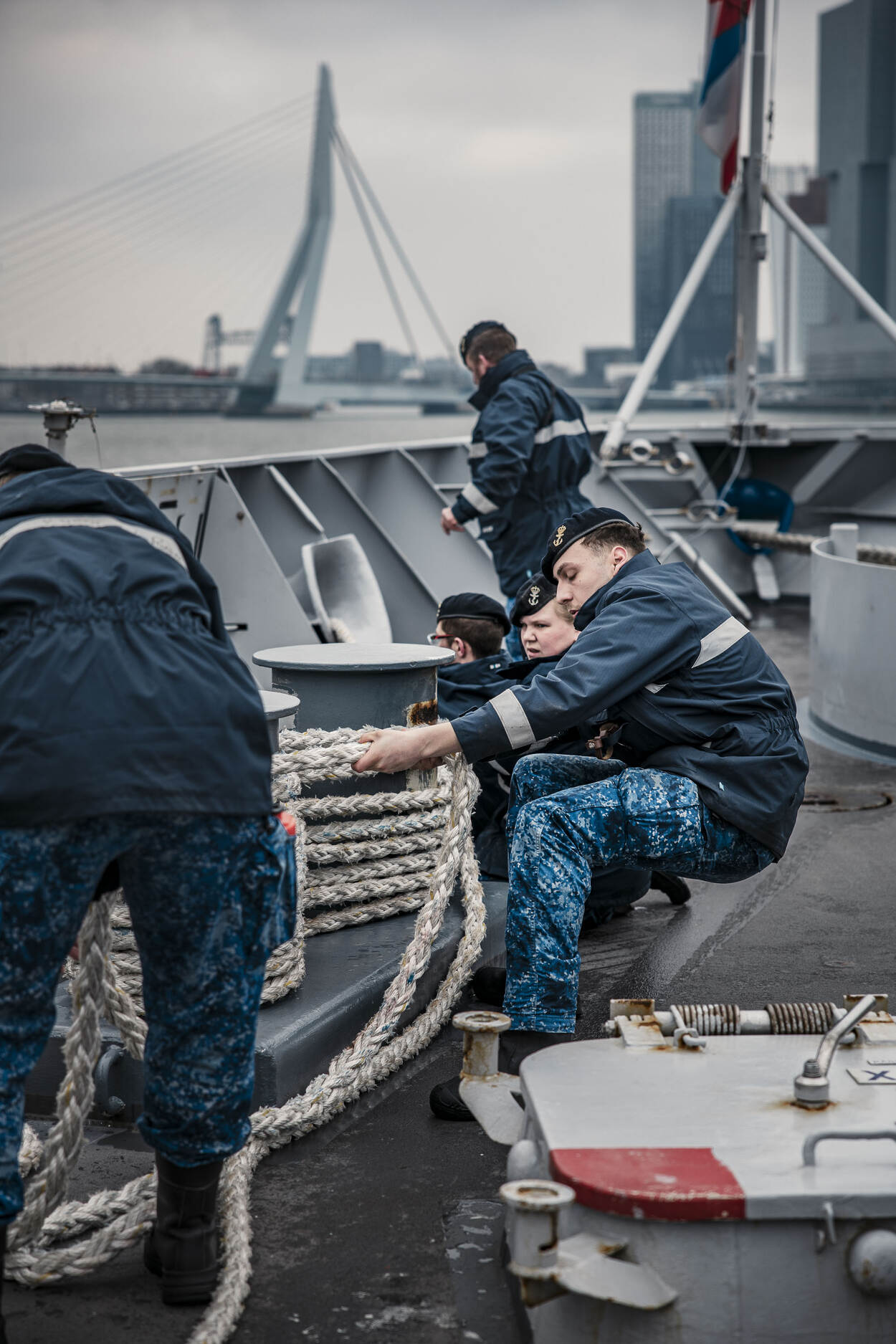 De nauten halen de trossen binnen. Op de achtergrond is de Erasmusbrug zichtbaar.