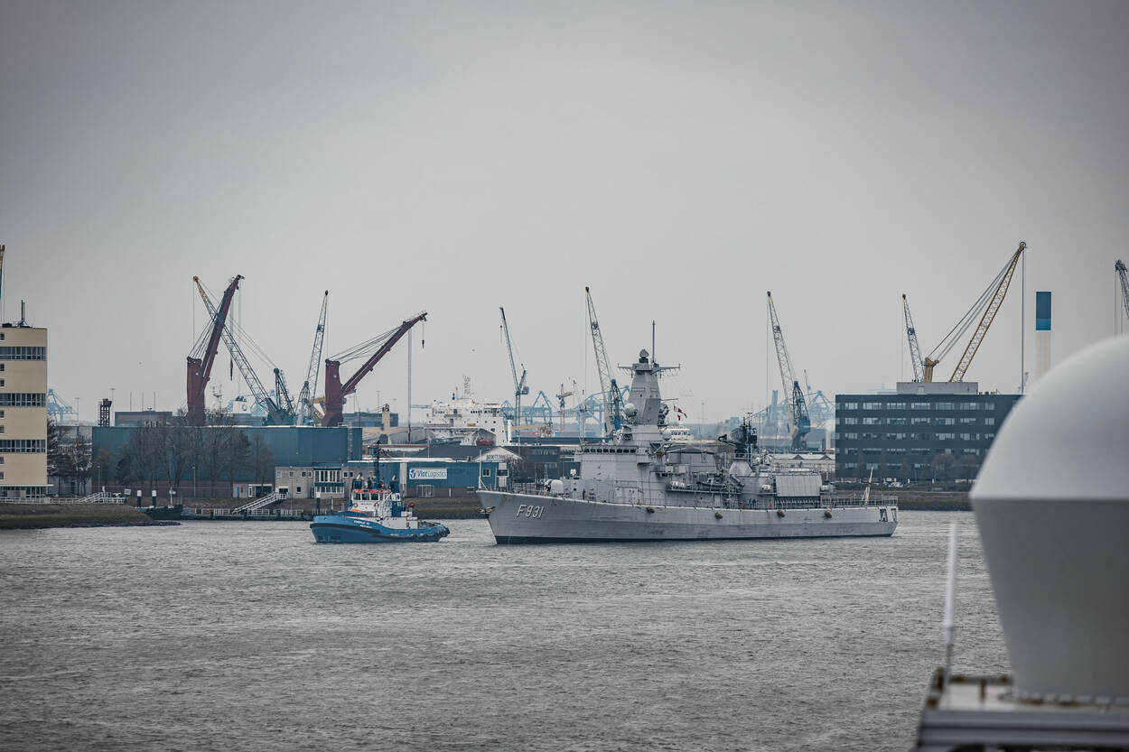 Het Belgische fregat BNS Louise-Marie komt aan in de haven van Rotterdam.