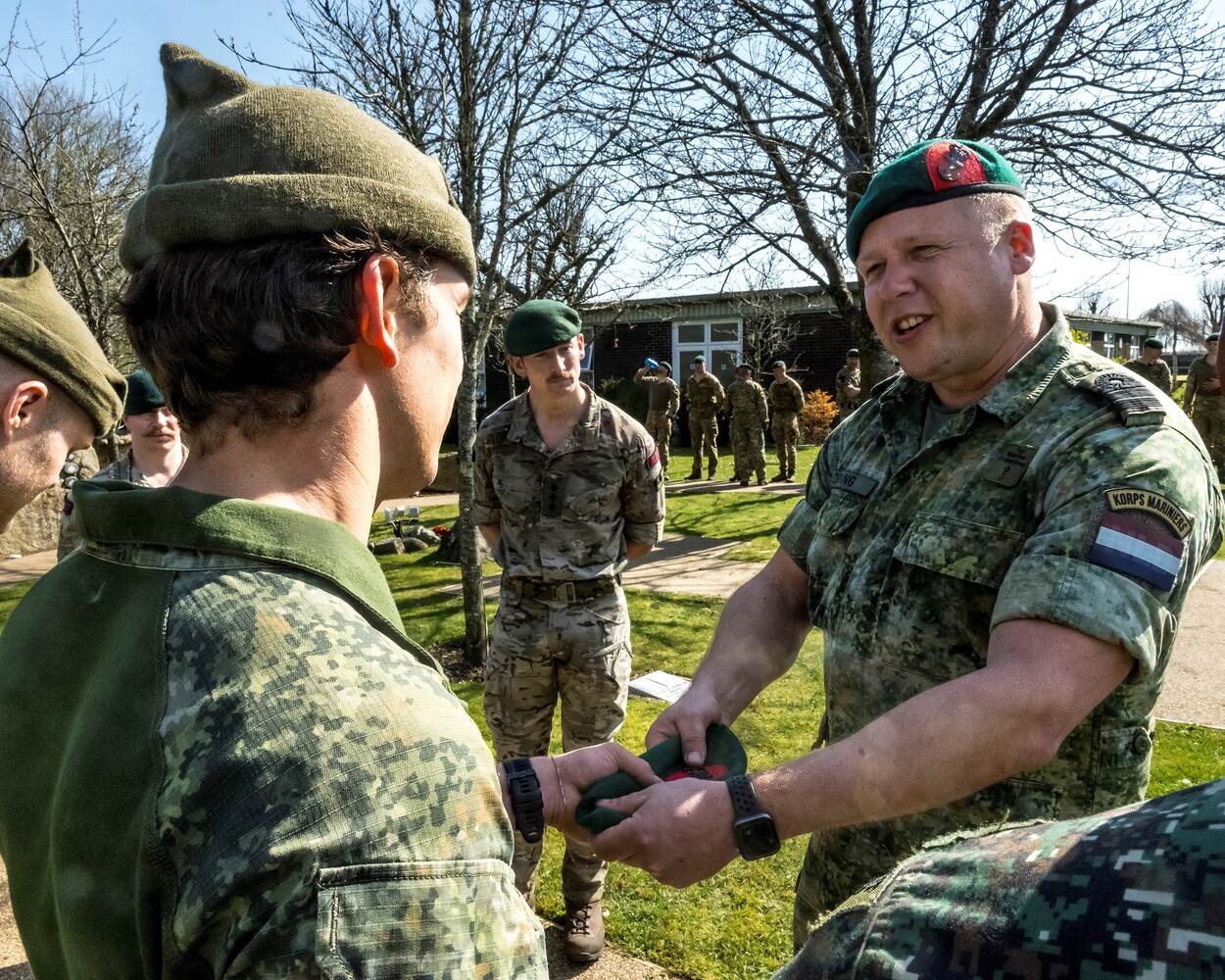 Samen met hun klas nam het zestal afgelopen donderdag op Royal Marines Base Bickleigh (nabij Plymouth) de kenmerkende groene baret in ontvangst. Vanaf dat moment mochten Jorn en de mariniers-1 Stefan, Wessel, Bennie, Jaimie en Bart zich Marine Commando noemen. Dat was nadat ze de uitputtende, 48 kilometer lange 30 Miler door het schilderachtige landschap van Dartmoor hadden volbracht. “Traditioneel gebeurt dat met 18 kilo bepakking en het persoonlijk wapen op de man”, aldus Jorn.