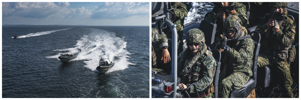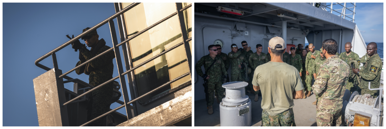 Tijdens Estribo draaide het dan ook niet alleen om mariniers. Ook het ondersteuningsschip Zr.Ms. Pelikaan leverde een belangrijke bijdrage. Zo was er tijdens de oefening een PASSEX op open zee met het Colombiaanse fregat ARC Independiente. Verder zorgde de ‘Peli’ natuurlijk voor transport en logistieke ondersteuning. Maar het ging verder dan die traditionele rol. “In het kader van hoofdtaak 1 wilde ik ook mijn bemanning trainen op gereedheid”, zegt commandant luitenant ter zee 1 Max Borsboom. “Het schip heeft niet veel bewapening, slechts 4 MAG-machinegeweren, en geen sensoren om dreiging waar te nemen. Het gaat echter om de mindset van de bemanning. Die moet zowel in vredestijd als oorlogstijd goed kunnen werken.”