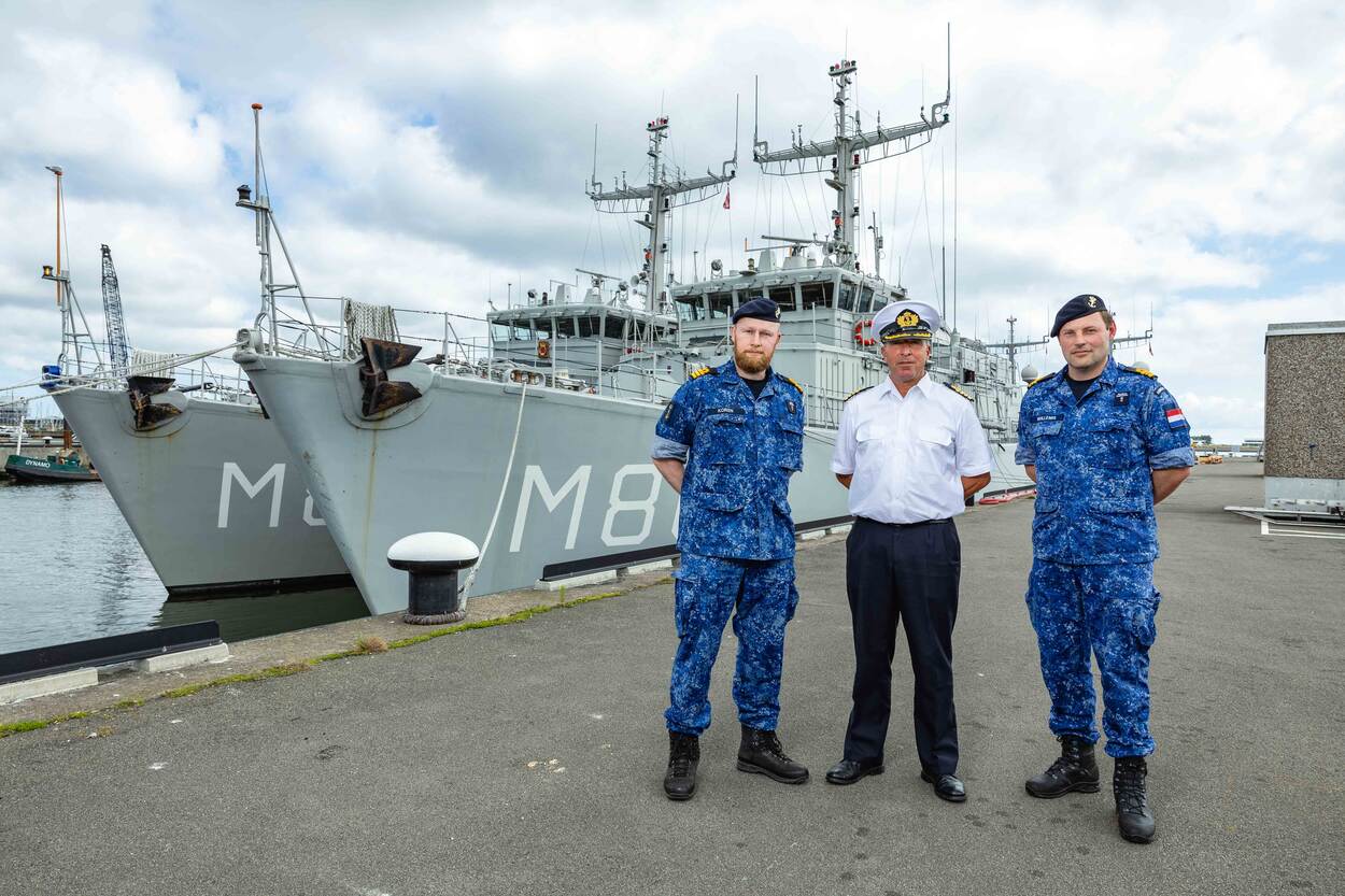 KLTZ Gerben Koren, KTZ Lex van der Kraan en LTZ 1 Ludo Willems voor ex-Zr.Ms. Urk in de haven van Den Helder.