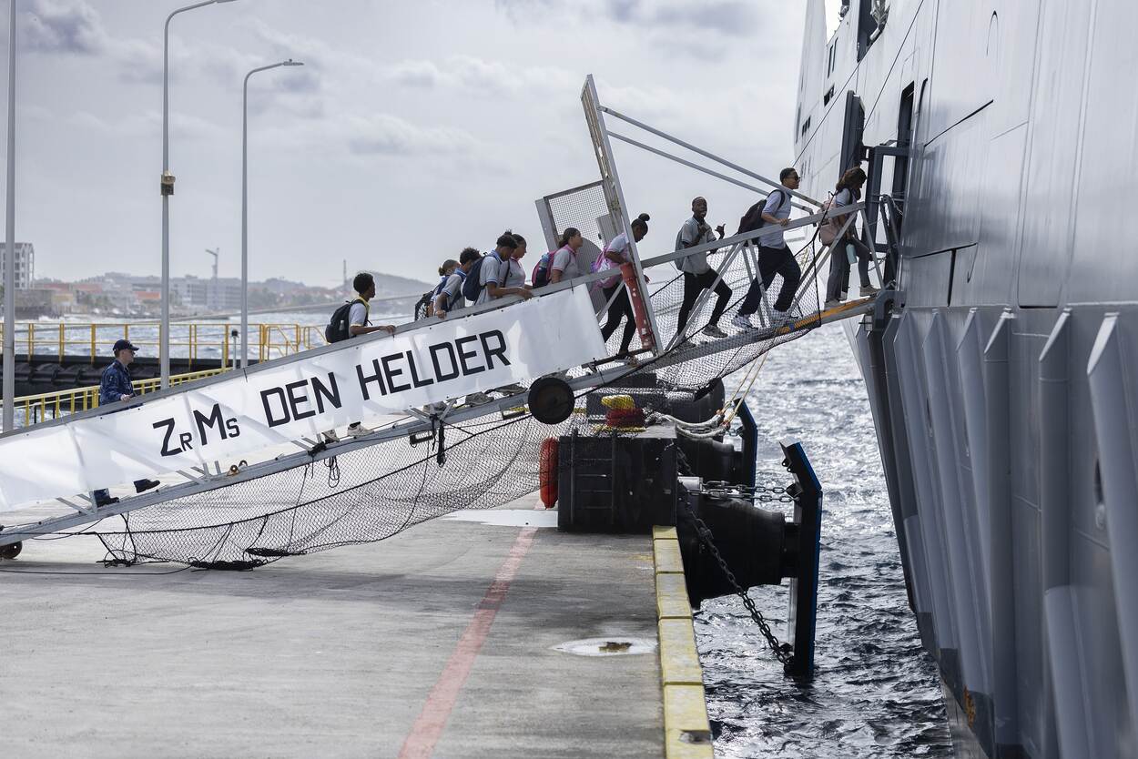 Woensdag 22 oktober opende de Den Helder haar deuren voor de schooljeugd van het eiland. Leerlingen van het Dr. Albert Schweitzer College werden in kleine groepjes rondgeleid en de bemanning van het schip toonde trots de nieuwste aanwinst. Op verschillende dekken keken de studenten hun ogen uit. Letterlijk en figuurlijk hoogtepunt was de brug, waar op ‘de stoel van de kapitein’ selfies gemaakt werden. “Kom alleen niet aan de knoppen, we willen niet per ongeluk wegvaren”, zegt een bemanningslid met een knipoog. De nieuwigheid straalt nog in alles van het schip af, dat viel de leerlingen ook op.