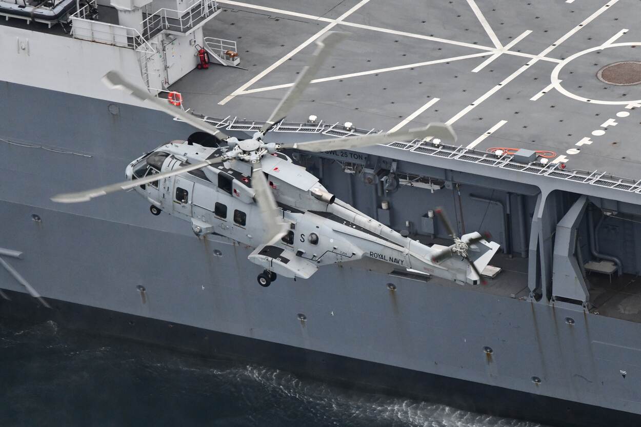 “Voordat de helikopters embarkeerden, oefenden we met 42 Commando op het gebied van boardings, waarbij de Britten bij ons aan boord klommen. 47 Commando – hun ‘bootgroep’ – voerde dokoperaties uit met landingsvaartuigen. Daarna staken we over naar het Franse Brest. Hier embarkeerden 2 Merlins en 30 man aan vliegers, vliegers-in-opleiding, instructeurs en technische en logistieke ondersteuning, nog aangevuld met een aantal klassen technisch en ondersteunend personeel.”