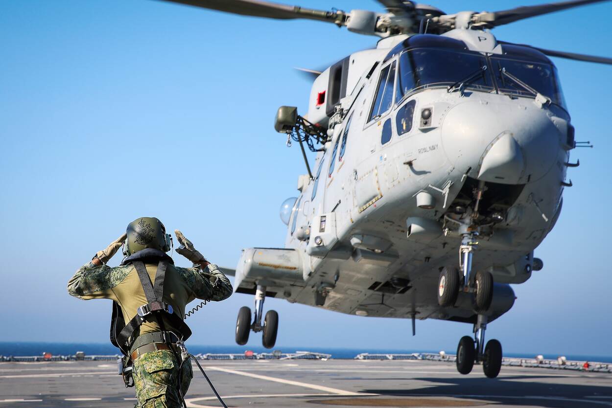 “Wij kwamen aan boord met 103 militairen – vliegers, bemanningsleden, engineers en ondersteunend personeel. De training draaide om 3 kernonderdelen. Om te beginnen het uitvoeren van nachtvluchten, waarbij vliegers operaties uitvoerden boven zee, onder minimaal zicht. Communicatie met zowel eigen als buitenlandse eenheden vormde hiervan een belangrijk onderdeel. Verder beoefenden we verticale bevoorrading, vertical replenishment (VERTREP, red.). Met helikopters brachten we voorraden en uitrusting naar andere schepen; een cruciale vaardigheid voor operaties ver van de eigen kust. Als derde trainingsdoel gold het veilig en goed uitvoeren van deklandingen en landingen op het strand. Hierbij werden zowel troepen als materieel afgezet binnen een realistische oefenomgeving.”