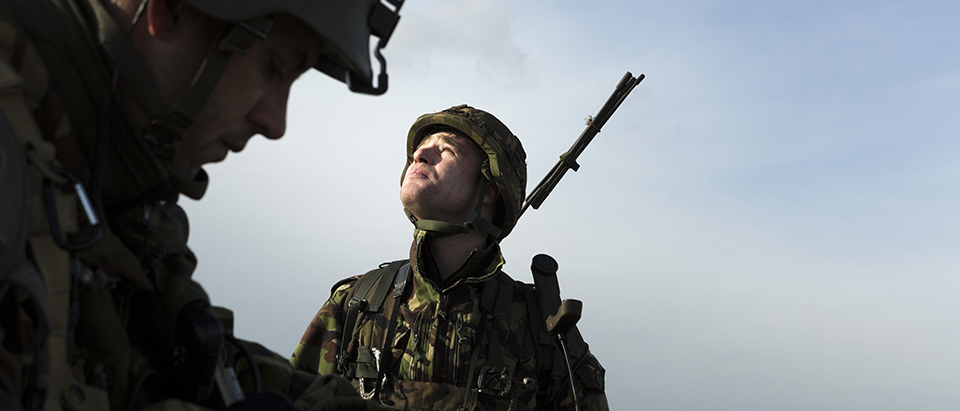 Zompige klei zuigt aan de kisten (legerlaarzen, red.), de schrale zuidenwind huilt over de braakliggende akker. PRRRT! PRRRT! Als één man werpt de groep onder leiding van sergeant 1 Remco Matthieu zich tegen de dijk. “KKW! Daar, vanuit die bosrand”, schreeuwt een van de mannen. Vanaf de overkant van het veld, een paar honderd meter verderop, ratelen machinegeweren. De infanteristen zitten in de tang.
