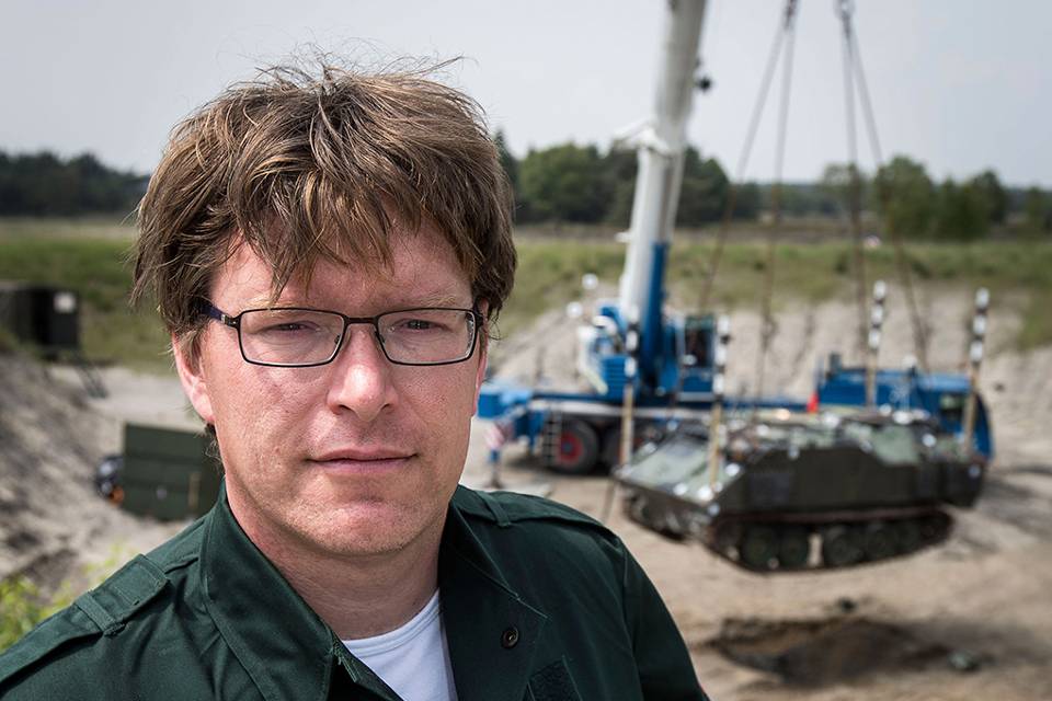 Samen met onderzoekers van TNO voeren Koen Bakker en zijn collega’s vandaag een mijntest uit met een YPR-pantserrupsvoertuig. Met andere woorden: ze blazen het voertuig op. “We zoeken naar mogelijkheden om voertuigbemanningen beter te beschermen”, legt Bakker uit. “Deze af te stoten YPR is representant van een bepaalde klasse pantservoertuigen en daardoor geschikt voor onze testen. We willen onderzoek doen naar de effecten op de bemanning bij het hoog opspringen van het voertuig na het exploderen van bijvoorbeeld een mijn. Met 1 knal kunnen we meer data vastleggen dan met literatuurstudies. “