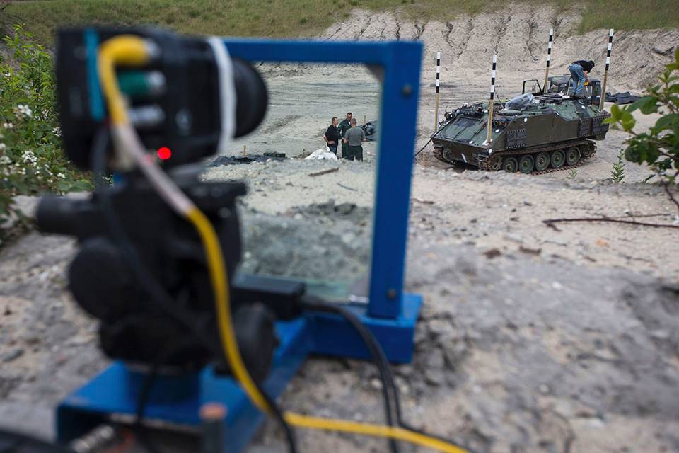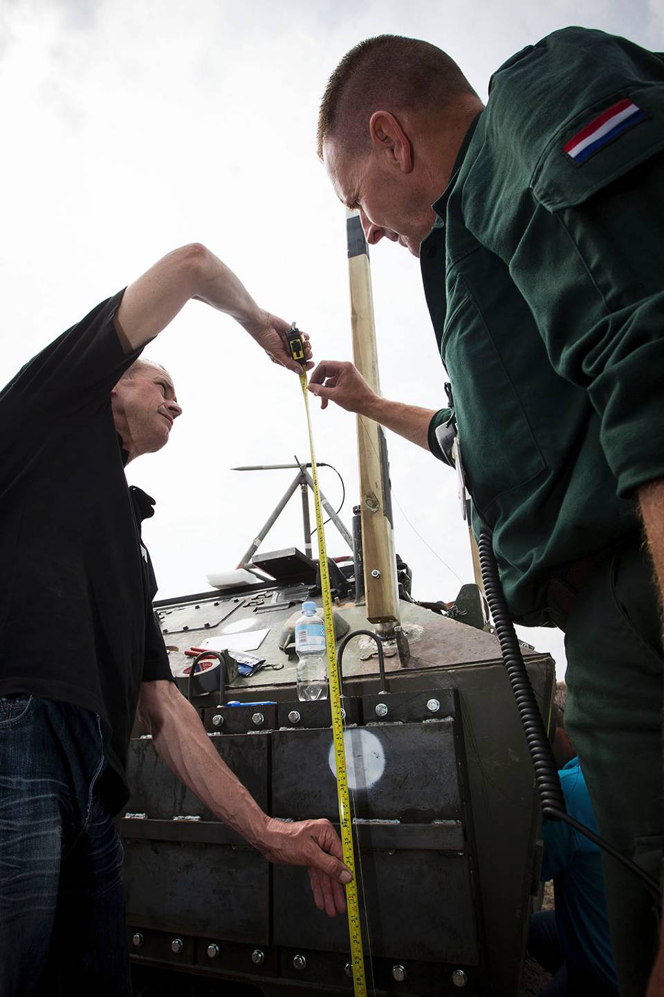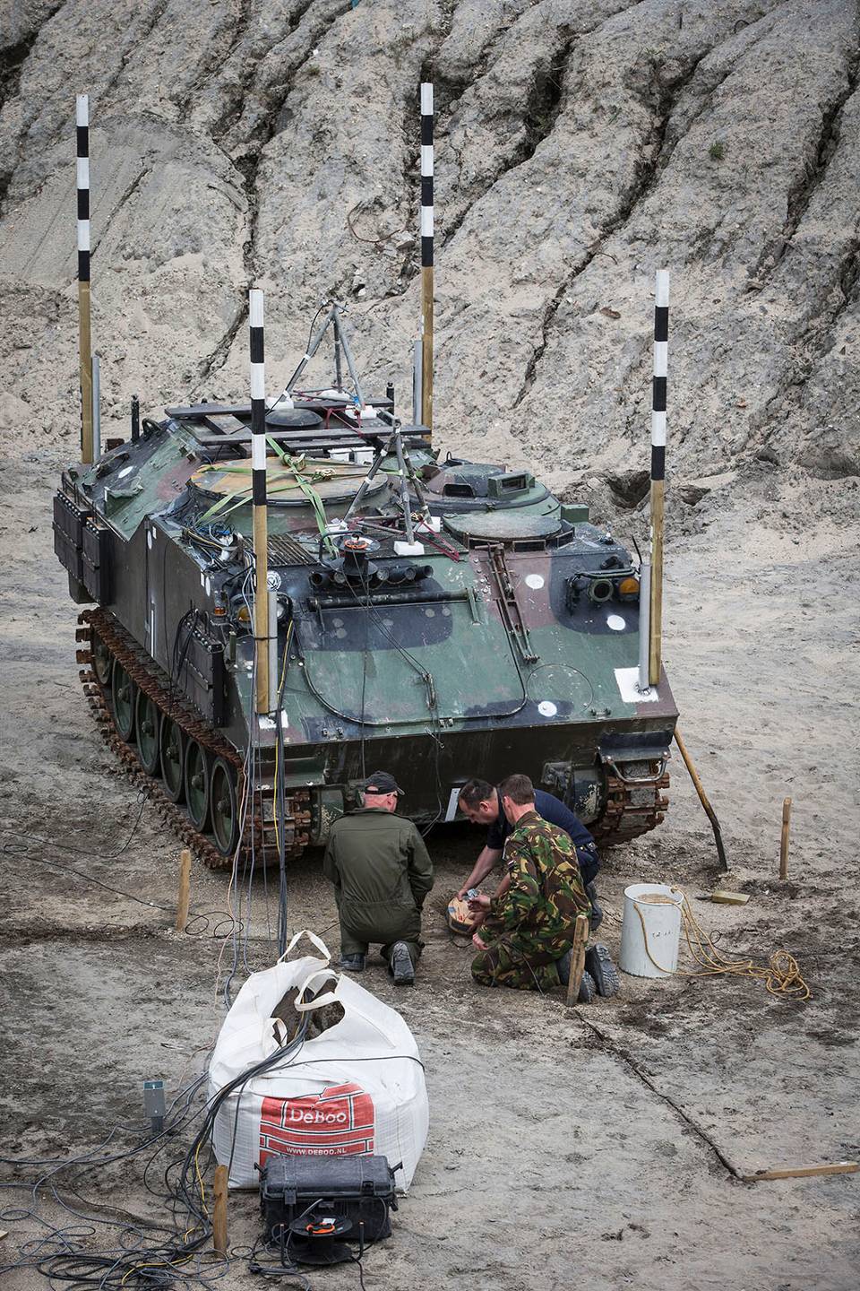 “We doen de voertuigtesten op een speciaal hiervoor ingericht deel van het Artillerie Schietkamp in ’t Harde. De grond is speciaal geprepareerd voor de explosie. De fysieke omstandigheden, zoals de bodemgesteldheid en de diepte van de springlading, moeten voor de testen zoveel mogelijk gelijk zijn. Alleen dan krijgen we meetresultaten die we goed met elkaar kunnen vergelijken.”