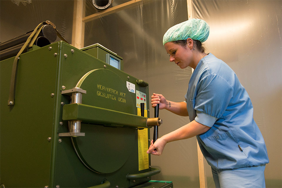 Renselaar: “Normaal gebruiken we onze sterilisatieapparatuur in veldhospitalen op bijvoorbeeld oefeningen of in uitzendingen. Voor ons was het leuk om onze eigen apparatuur eens in te zetten voor een gewoon ziekenhuis.”