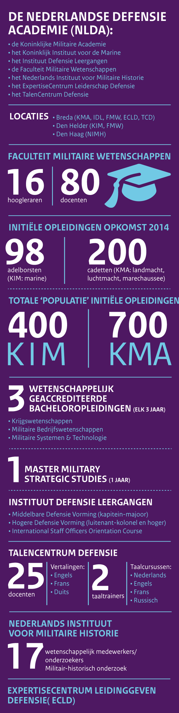 De Koninklijke Militaire Academie (KMA) en het Koninklijk Instituut voor de Marine (KIM) zijn de bekendste ‘merken’ van de Nederlandse Defensie Academie, de NLDA. Al bijna 200 jaar zijn de officiersopleidingen in respectievelijk Breda en Den Helder de kweekvijver voor de leidinggevenden van de krijgsmacht. De kracht van de NLDA zit juist in het totaal van de instelling, benadrukt generaal Vleugels. “Wij verzorgen alle militaire initiële én vervolgopleidingen voor alle officieren van de gehele krijgsmacht. Dat gaat van infanterist tot vlieger en van marineman- of vrouw tot marechaussee.”