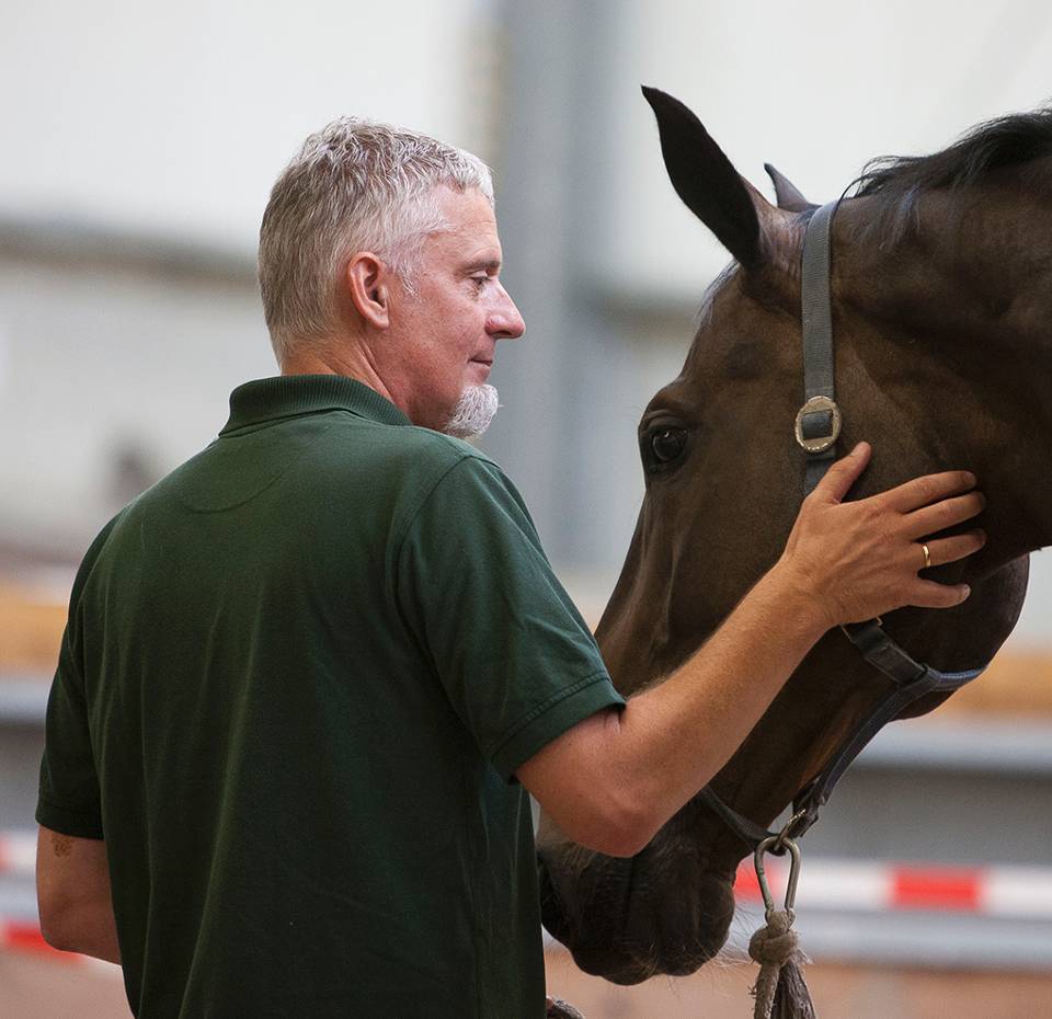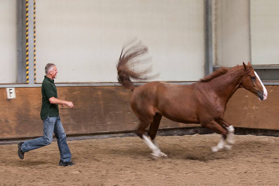 De viervoeter waarmee de cursisten samenwerken is Claudio, een 7 jaar oude ruin. Met een schofthoogte van 1 meter 80 het grootste paard op stal. Eén bonk spieren. Erg imponerend. Zeker voor 3 van de 6 deelnemers die nauwelijks de 1 meter 60 overstijgen. “Hij is een vriendelijke reus,” vertelt psychologe Carine Tromp Meesters. “Al heeft hij wel leiding nodig. In een oogwenk scheidt hij het kaf van het koren.”
