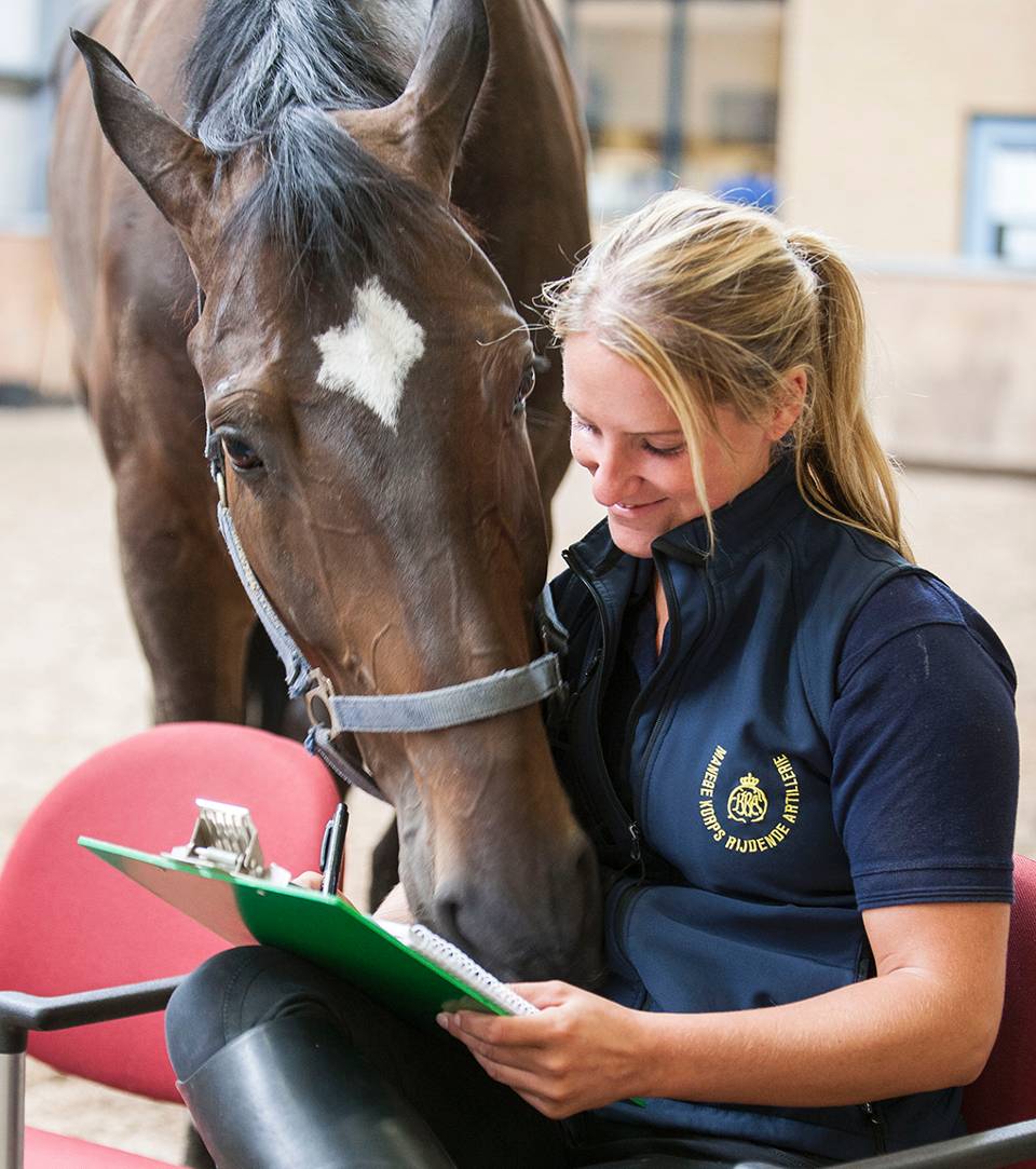 Denk niet aan geblinddoekt rijden of halsbrekende sprongen. Het concept is simpel. Een handjevol officieren, veelal zonder ervaring met paarden, gaat één voor één de confrontatie aan met het edele dier. Houding, lichaamstaal en ‘energie’ zijn het enige waarmee zij het paard moeten laten doen wat zij willen. “Paarden spiegelen heel puur”, vertelt korporaal 1 Angela Kalkman, plaatsvervangend bedrijfsleidster op de manege van het Korps Rijdende Artillerie. “Straal jij rust en zelfvertrouwen uit en blijf je consequent, dan zal het paard je eerder als leider accepteren.”